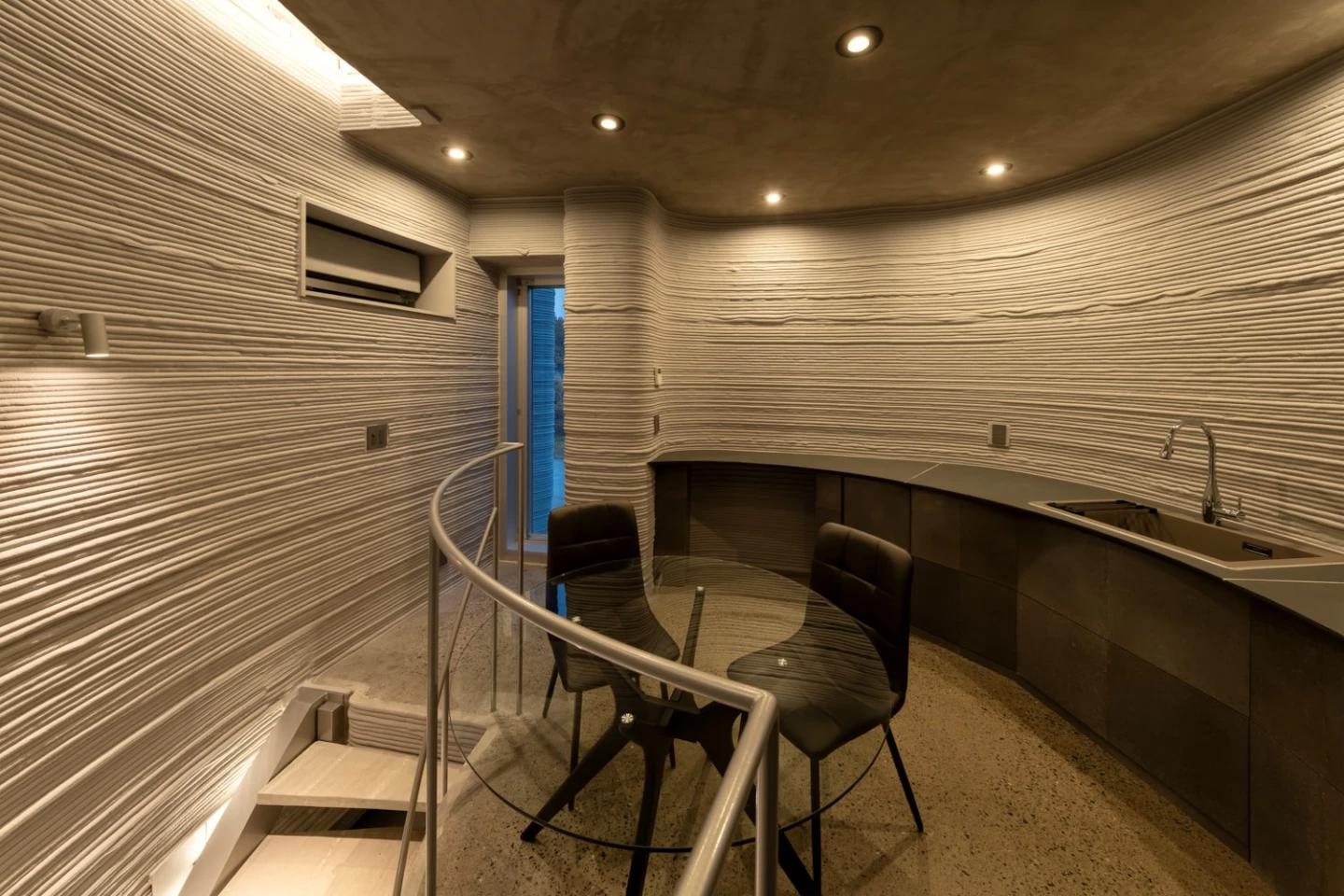 Поскольку Япония находится в зоне высокой сейсмической активности, устойчивость конструкции стала ключевой задачей. Дом закреплен на армированном ленточном фундаменте со сваями, укрепляющими грунт. Основную нагрузку несет железобетонный каркас, внутри которого размещены напечатанные стены. Интерьер поддерживает «пещерную» эстетику: изогнутые поверхности, световые люки вместо обычных окон и необычная планировка, где кухня-гостиная расположена на верхнем уровне, а на первом этаже находится спальня с собственной ванной комнатой. Проект создан как демонстрационный, однако разработчики уже рассматривают возможность применения технологии для строительства жилья и объектов восстановления после стихийных бедствий.