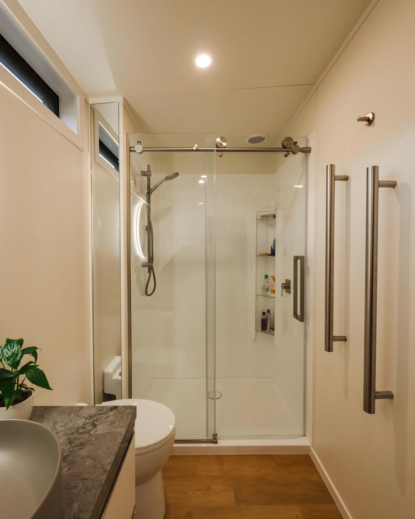 Ванная комната для мини-дома выглядит особенно просторной: стеклянная душевая кабина, тумба с раковиной, полноценный унитаз, а также стиральная машина и сушилка.
