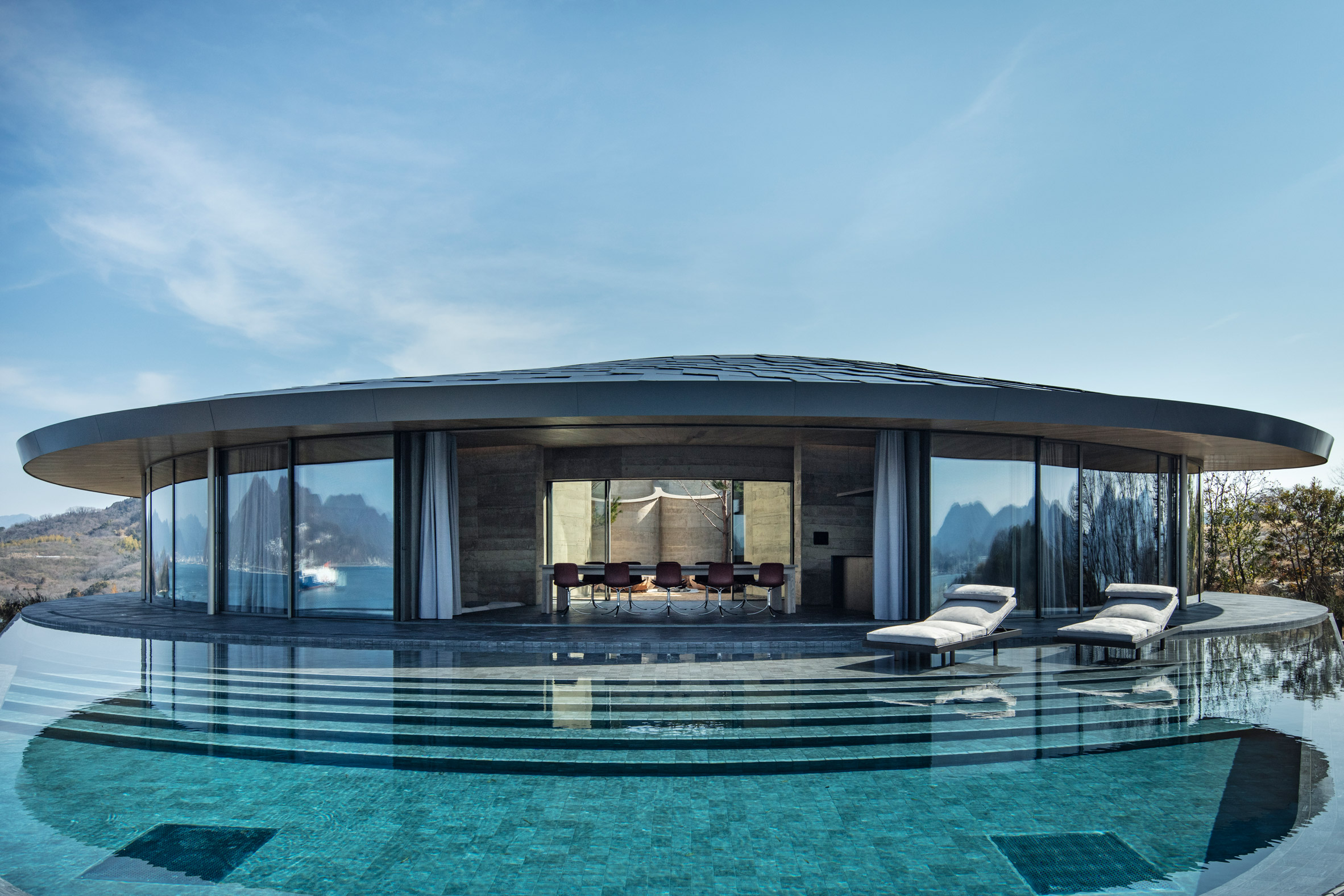 Архитектура дополнена стеклянными фасадами, стирающими границу между интерьером и природой. В оформлении используются элементы, отсылающие к японским традициям: полы из чёрного сланца, напоминающие татами, и крыши с солнечной черепицей, интерпретирующие классические кровли.