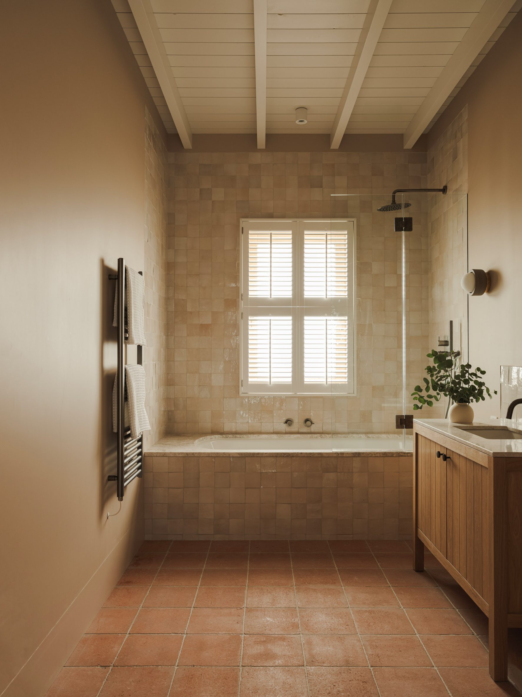 Верхний этаж включает две спальни под скатами крыши восточного объёма. Главная спальня с ванной ориентирована на море, а стены отделаны белыми деревянными панелями, создающими лёгкую и воздушную атмосферу.