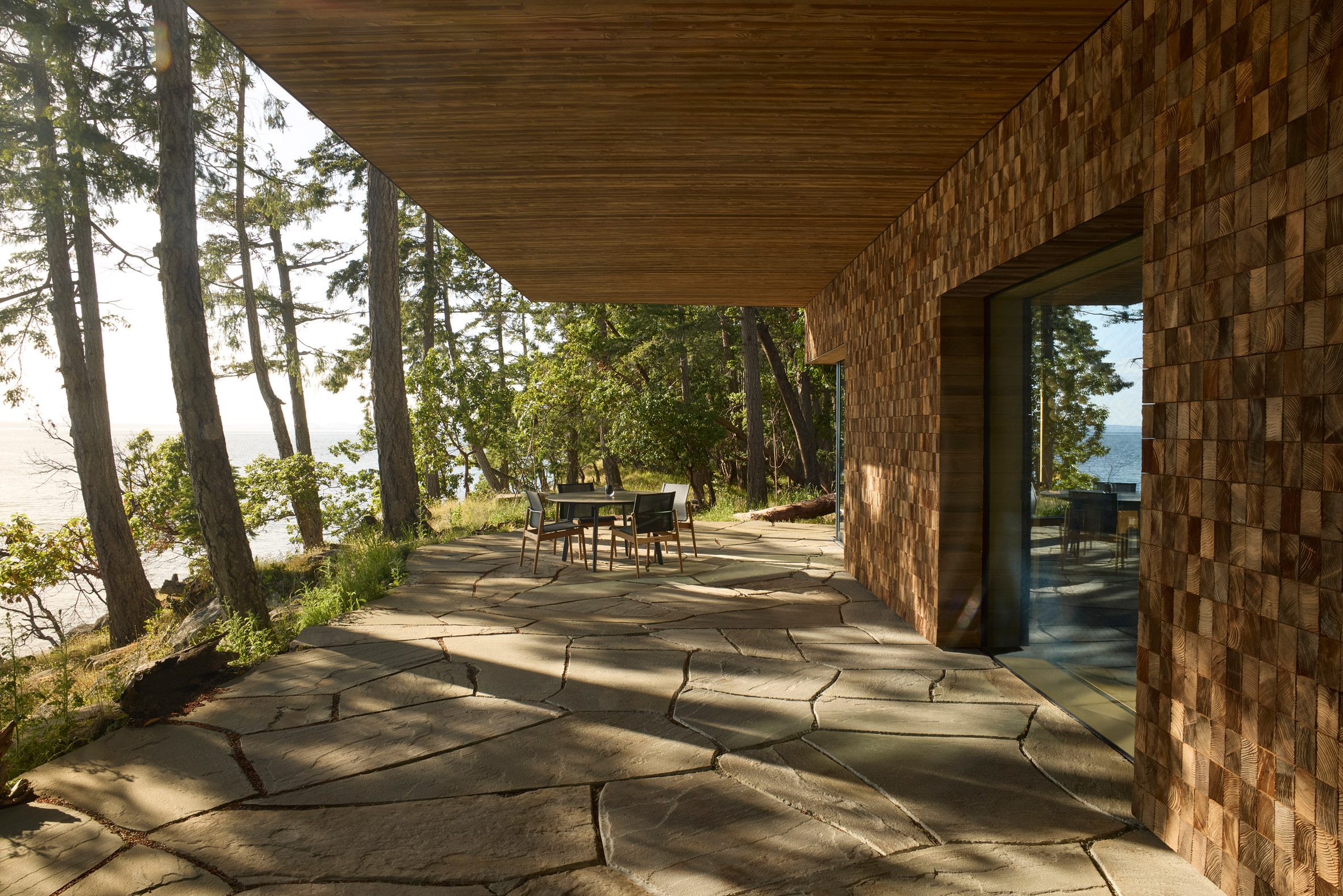 Дом площадью 300 кв. метров, получивший название Bridge House, расположен на крутом участке площадью 3 акра на острове Гальяно, Британская Колумбия. Окруженное деревьями, здание перекинуто через два скалистых хребта и перекрывает затопленный овраг, заросший папоротниками. На этом участке ожидается повышение уровня воды из-за изменения климата, что может привести к затоплению оврага.