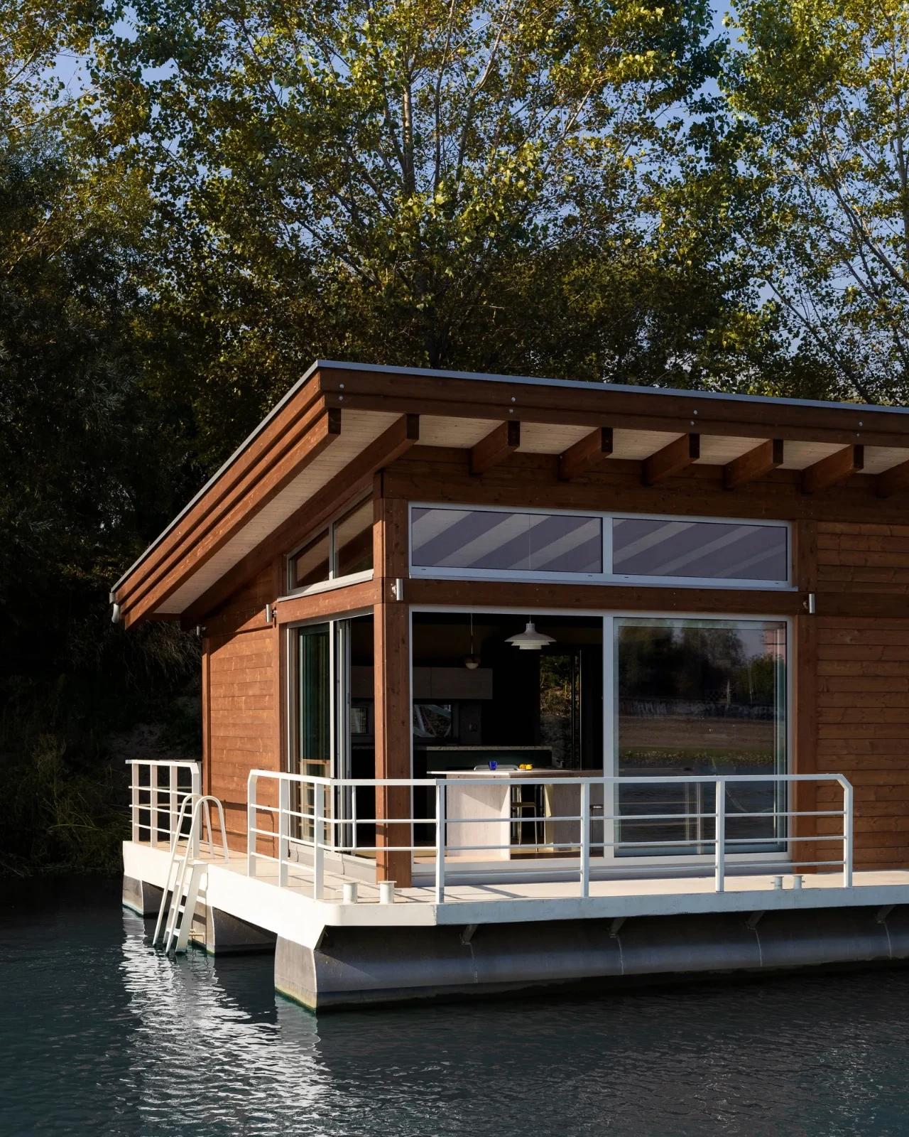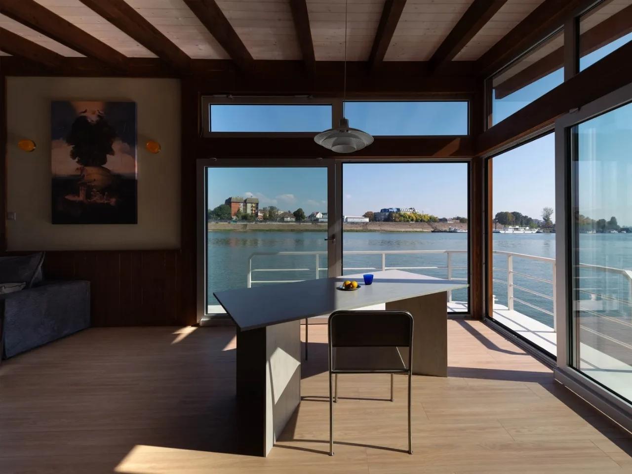 Компактная постройка размером 8 х 6 метров, получившая название Sava River, расположена на стационарном понтоне и объединяет функциональность с поэтичностью. Несмотря на скромные размеры, она удивительным образом создаёт ощущение простора и свободы. Внутри — светлые пространства, где открытая планировка стирает границы между интерьером и природой, а большие окна превращают виды реки в живые картины, меняющиеся от утреннего тумана до золотого заката.