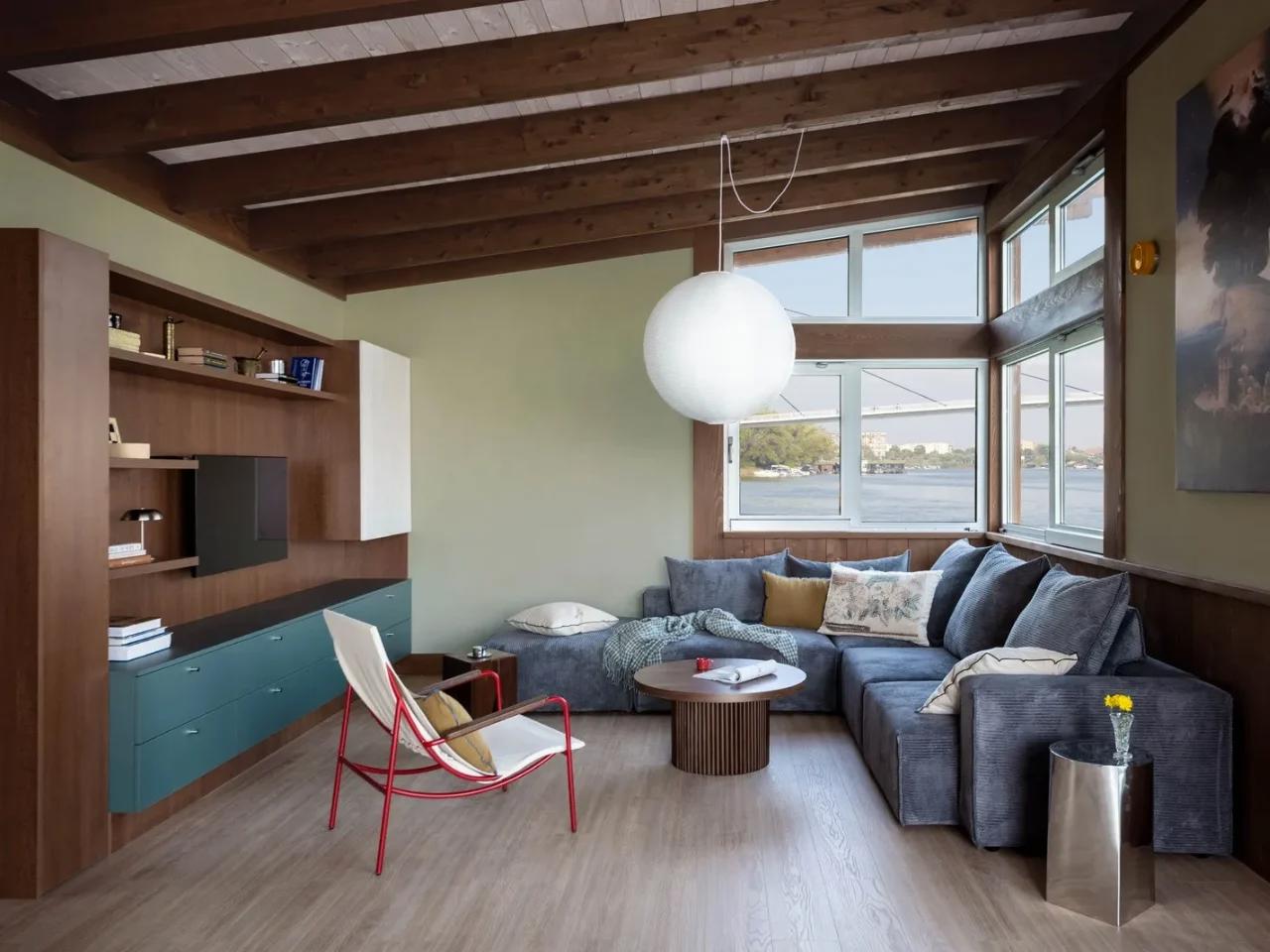 Каждый элемент интерьера продуман так, чтобы быть одновременно красивым и функциональным: строгие шкафы создают ощущение устойчивости, металлические детали добавляют динамики, а деревянные поверхности дарят тепло и естественность. Сама конструкция дарит ощущение устойчивости и лёгкости, словно домик дышит вместе с рекой, подстраиваясь под её ритм.