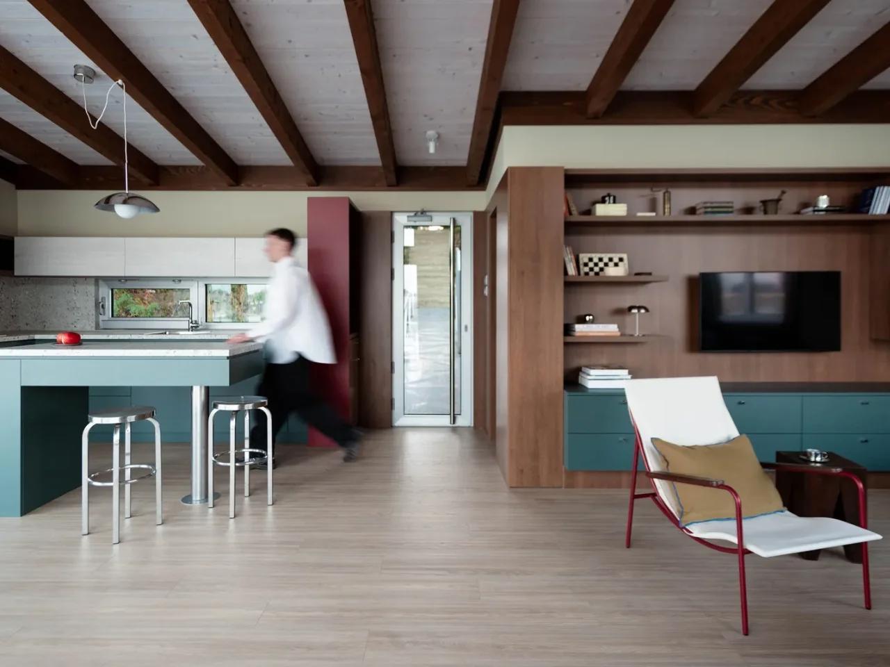 Дерево и металл переплетаются в текстурном контрасте, глубокие зелёные тона перекликаются с водой, а красные акценты напоминают морские навигационные знаки, создавая атмосферу уюта и связи с наследием старых верфей. В этом сочетании материалов чувствуется уважение к традициям и одновременно стремление к современности.