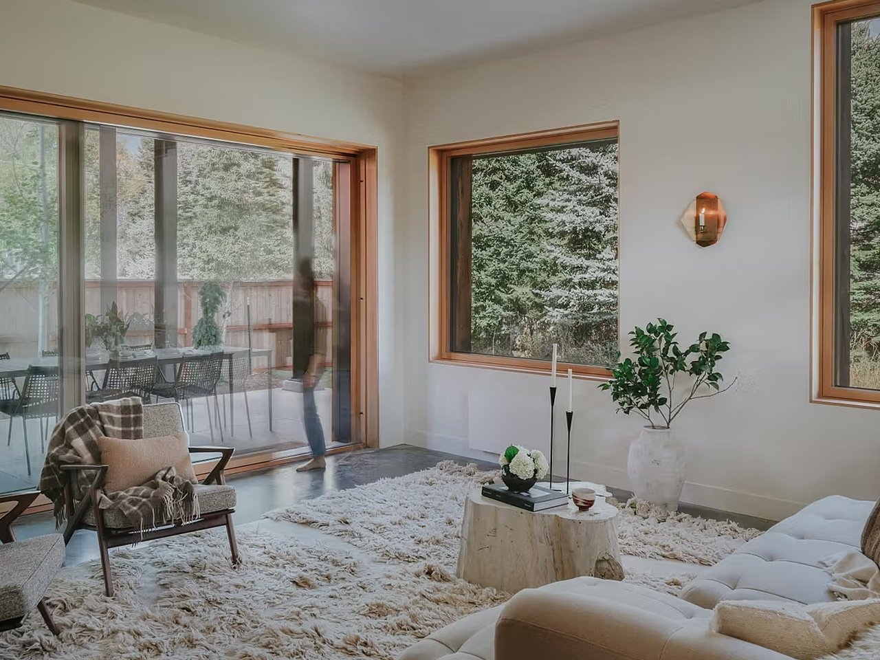 Внутренние пространства максимально используют естественное освещение и открывают вид на горы. Большие окна с деревянными рамами наполняют интерьер дневным светом. Планировка включает просторные места для хранения и практичную прихожую, что соответствует реалиям жизни в горах, где для хранения снаряжения для отдыха на природе и сезонного инвентаря требуется отдельное пространство.