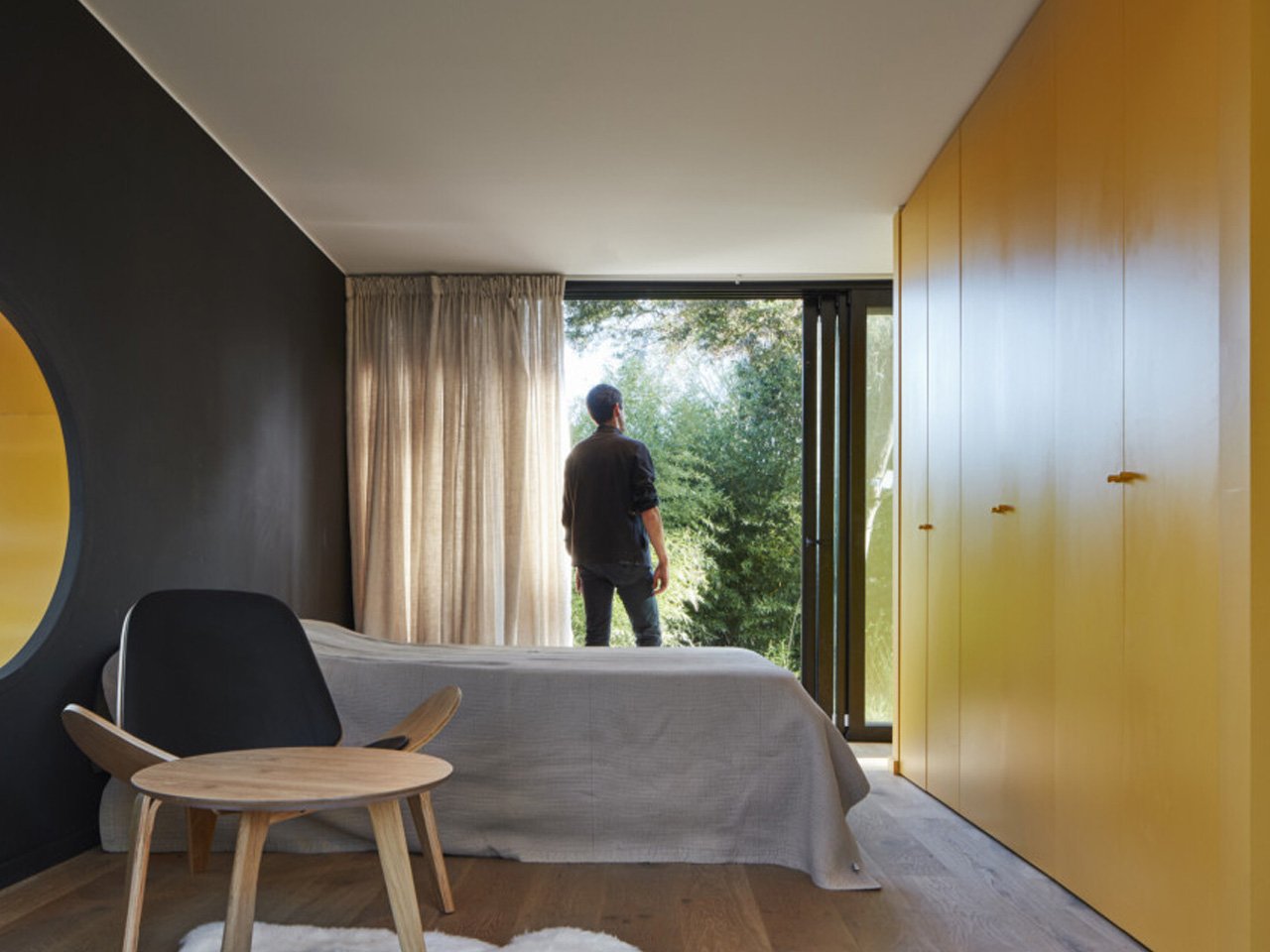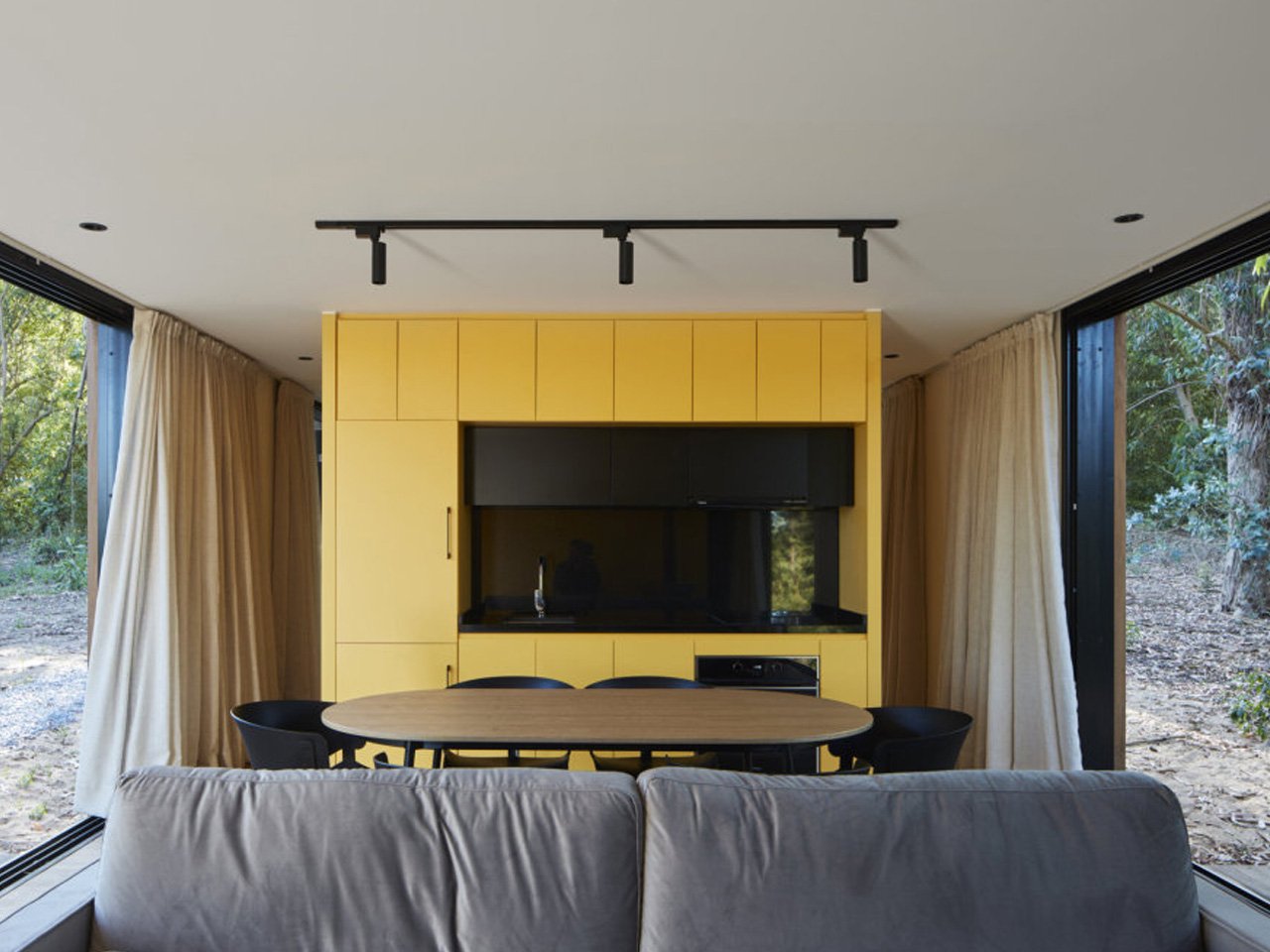 Архитекторы студии разработали проект дома, который не навязывается ландшафту, а становится его частью. Дизайн этого компактного сооружения стирает границы между внутренним и внешним пространством, благодаря гениальной системе больших раздвижных стеклянных панелей, которые фактически делают стены невидимыми.