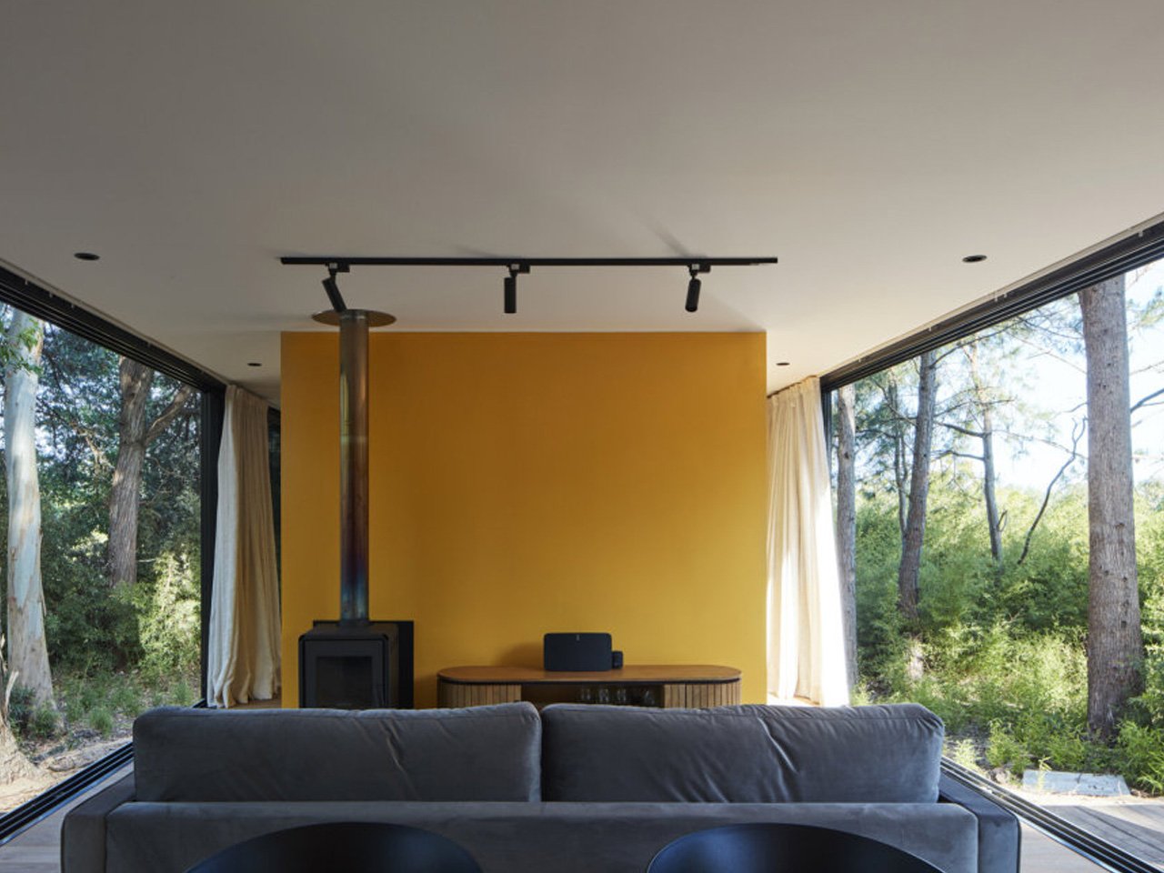 В дневное время скромный фасад здания и натуральные материалы позволяют ему органично вписываться в окружающую среду. С наступлением темноты внутреннее освещение проникает сквозь обширные стеклянные поверхности, превращая дом в тёплый золотистый маяк, видимый сквозь деревья. Эта ночная метаморфоза придаёт дому особый характер и создаёт почти мистическое присутствие в лесу. Эффект не резкий и не навязчивый — скорее, он напоминает тихий костер.