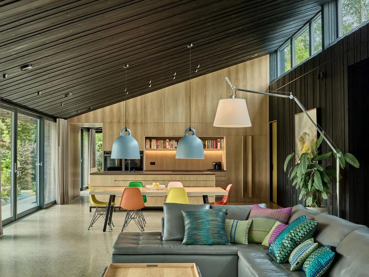 По словам архитекторов, была разработана планировка, учитывающая особенности участка, а материалы выбирались с точки зрения эстетики и бюджета. Такой подход позволил создать дом, органично вписанный в среду и демонстрирующий сдержанность.