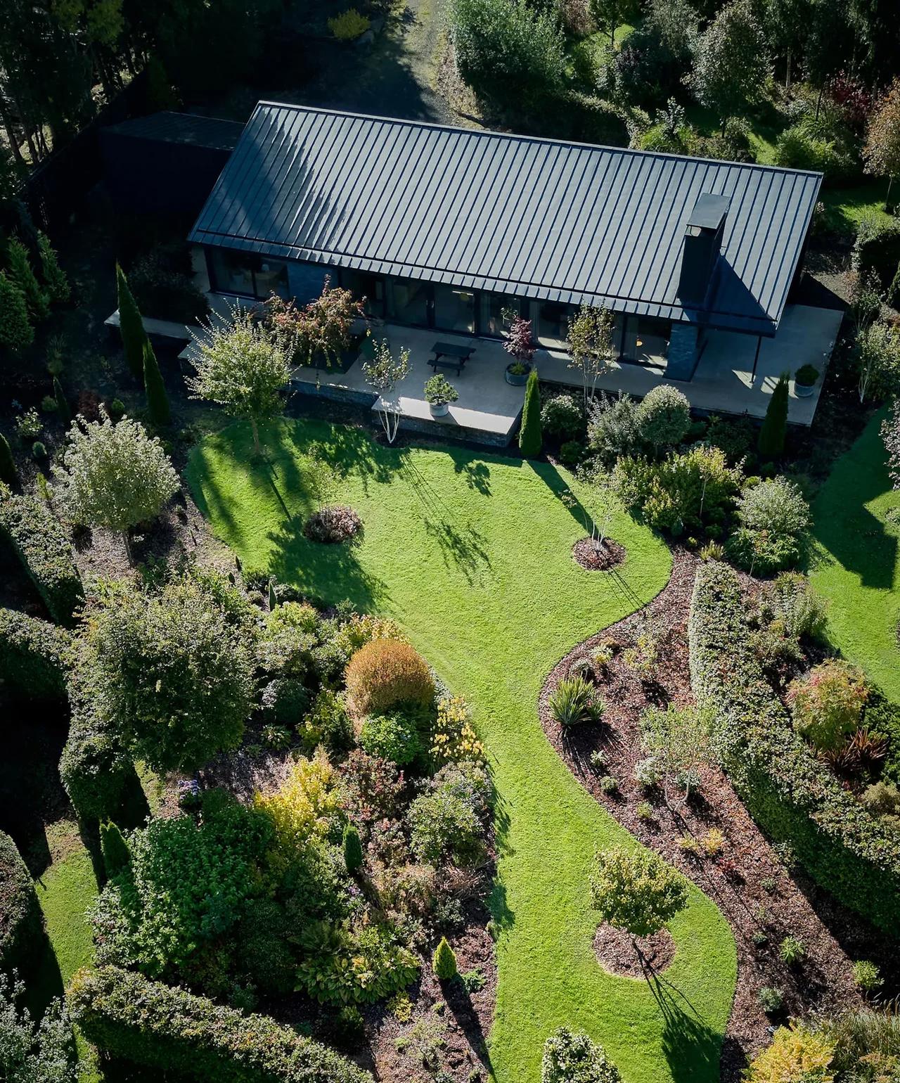 Название Grianan переводится с гэльского как «солнечное место». Одноэтажный дом с двумя спальнями словно растворяется в ландшафте и саду, который владельцы выращивали с 2017 года. На месте бывшего поля теперь процветает фруктовый сад с берёзами и японскими клёнами, куда регулярно прилетают куницы, совы и дятлы.