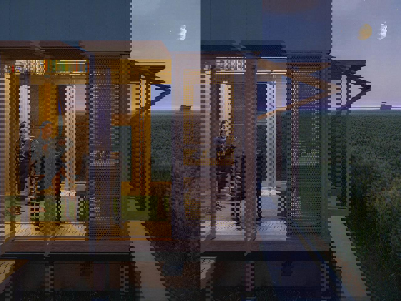 Дом площадью всего 25 кв. метров оснащён системой сбора дождевой воды, рециркуляции сточных вод и скважиной для возврата очищенной воды обратно в водоносный горизонт. Архитектура дома гармонично вписывается в сельский ландшафт Пенджаба: приподнятый деревянный каркас минимизирует давление на почву, позволяя воде, воздуху и растительности свободно циркулировать под ним.