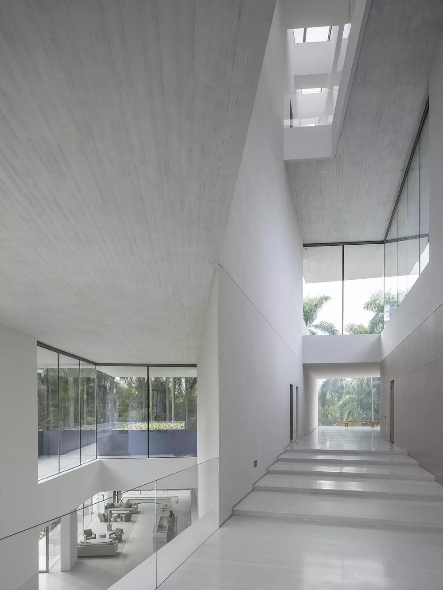 Центральное пустое пространство объединяет этажи, позволяя видеть сразу несколько перспектив и напоминая, что ни одна точка обзора не даёт полной картины мира. Основным материалом стал бетон, но его поверхности украшены акцентами из древесины, создающими тактильную текстуру и мягко связывающими архитектуру с природой. Свет, проникающий сверху, меняется в течение дня и сезонов, превращая интерьер в живую хронику времени.