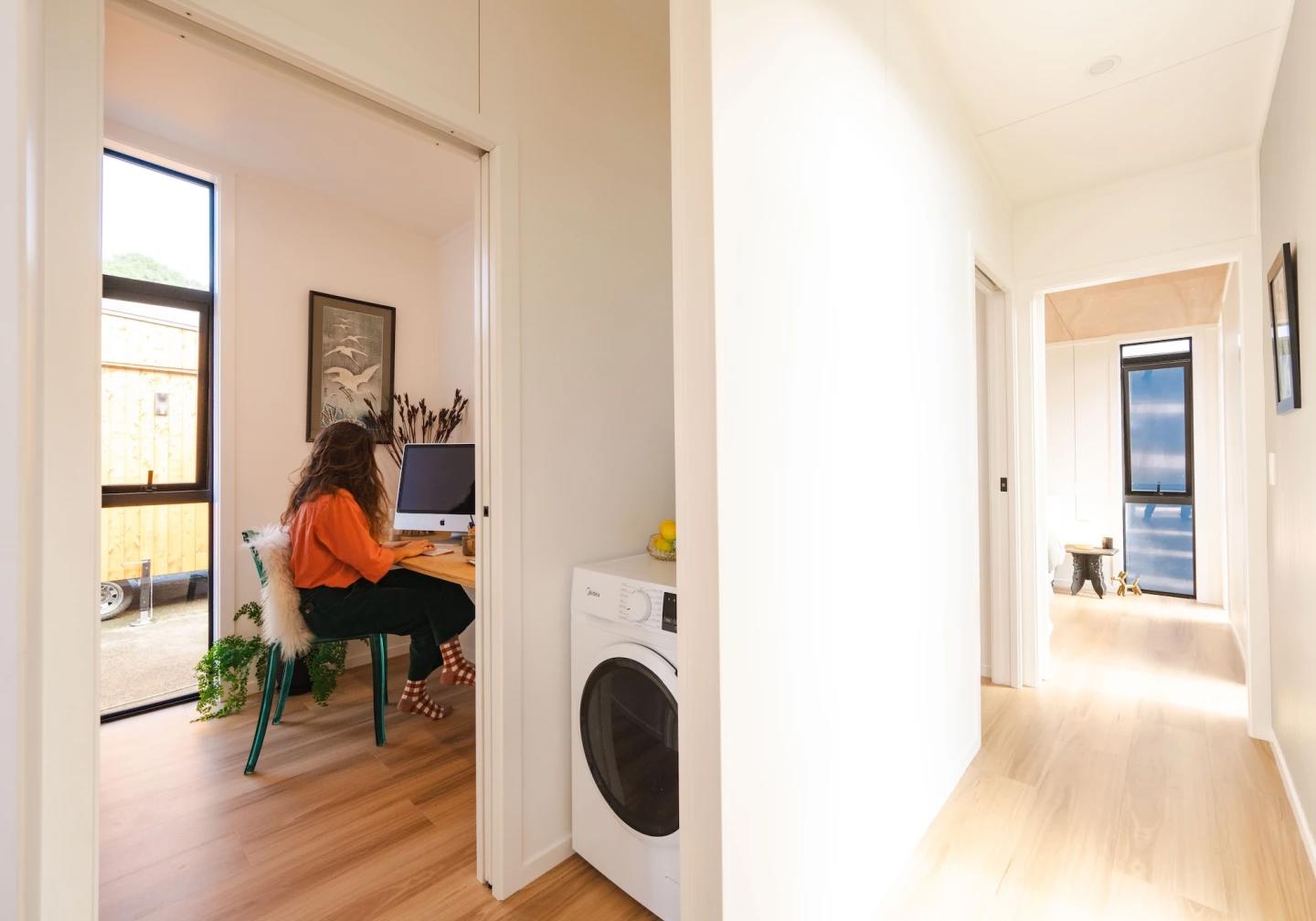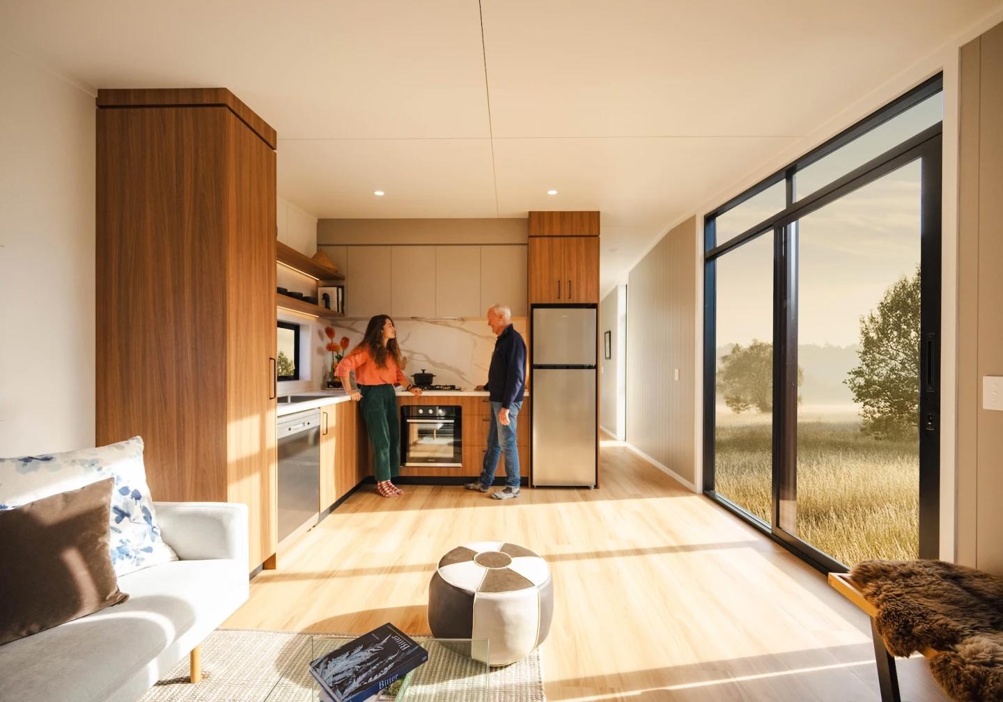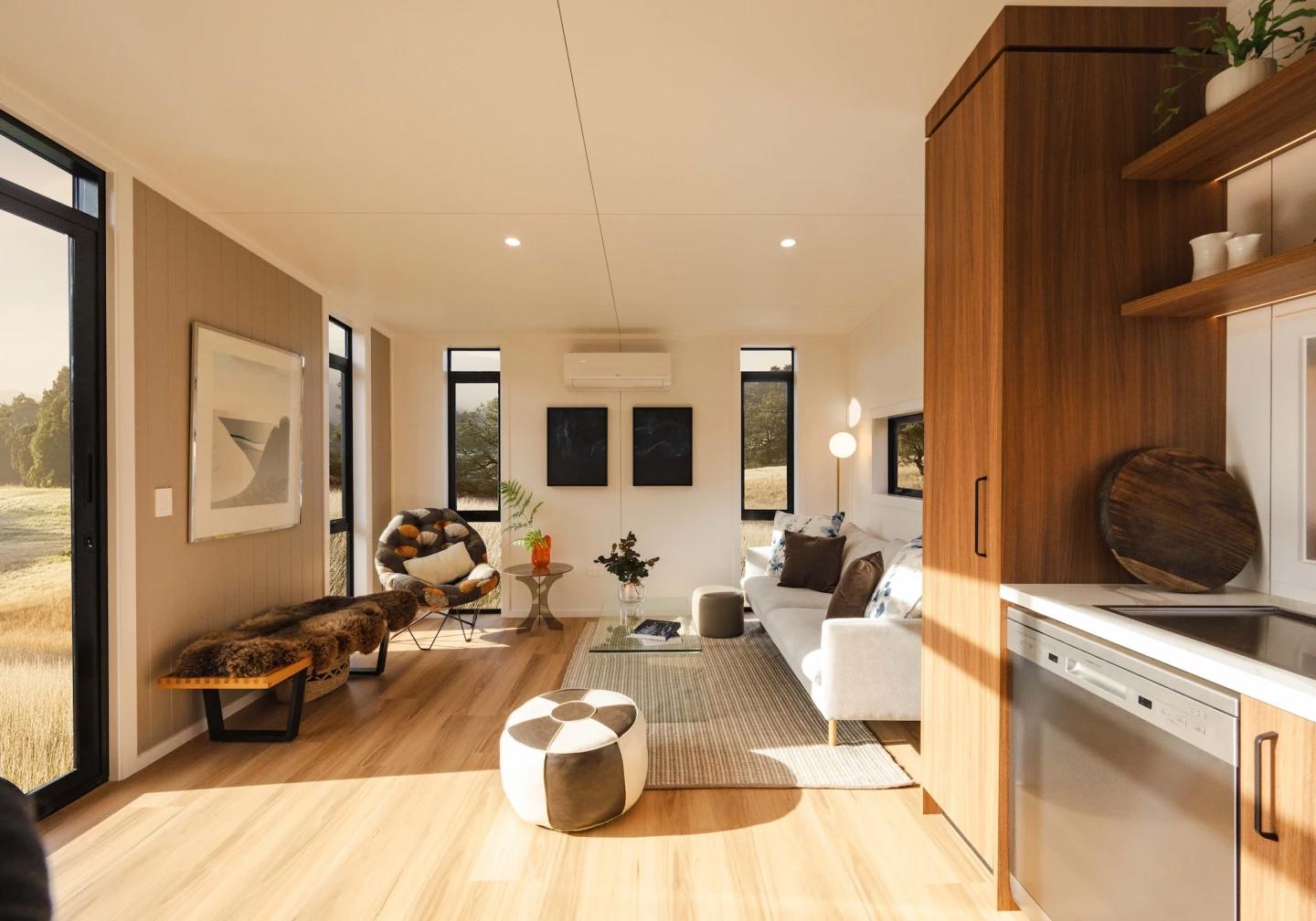 Несмотря на компактный формат, мини-дом под названием Natural Luxe удивляет ощущением простора и света. Одноэтажная планировка включает открытую кухню-гостиную внушительных размеров и отдельный домашний офис, что редкость для домов такого класса.