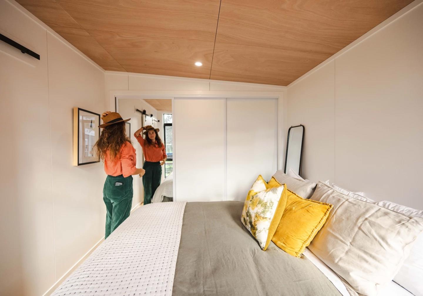 Далее по коридору находится ванная комната, оформленная аккуратно и современно. В ней предусмотрены подвесная раковина, унитаз и душевая кабина со стеклянными дверями. Спальня расположена в противоположной части дома, вдали от входа и гостиной. Благодаря одноэтажной конструкции здесь можно свободно стоять в полный рост. Комната оборудована двуспальной кроватью и встроенным шкафом, обеспечивая комфорт, сопоставимый с полноценным домом.
