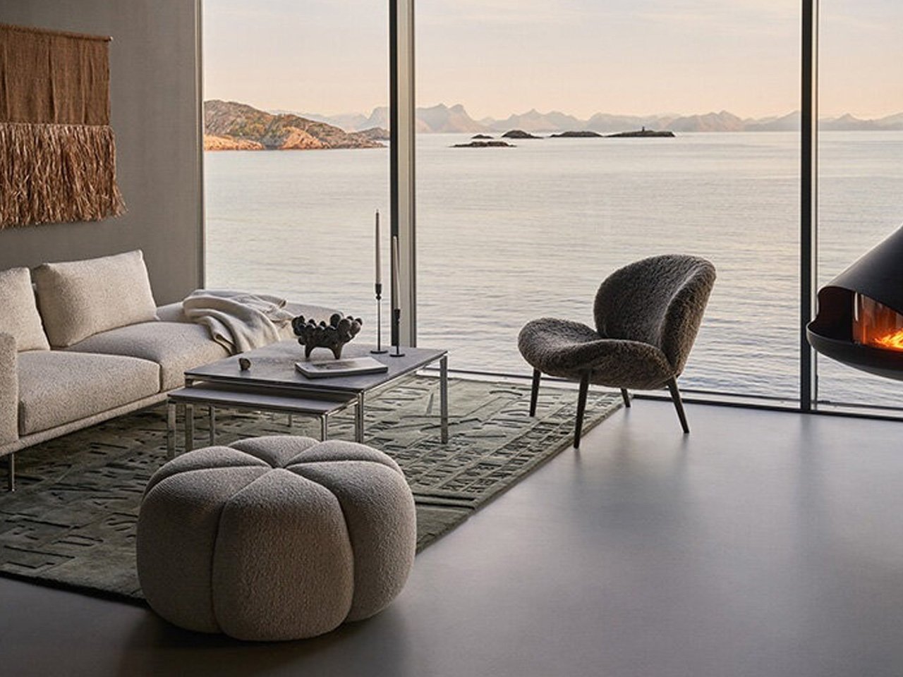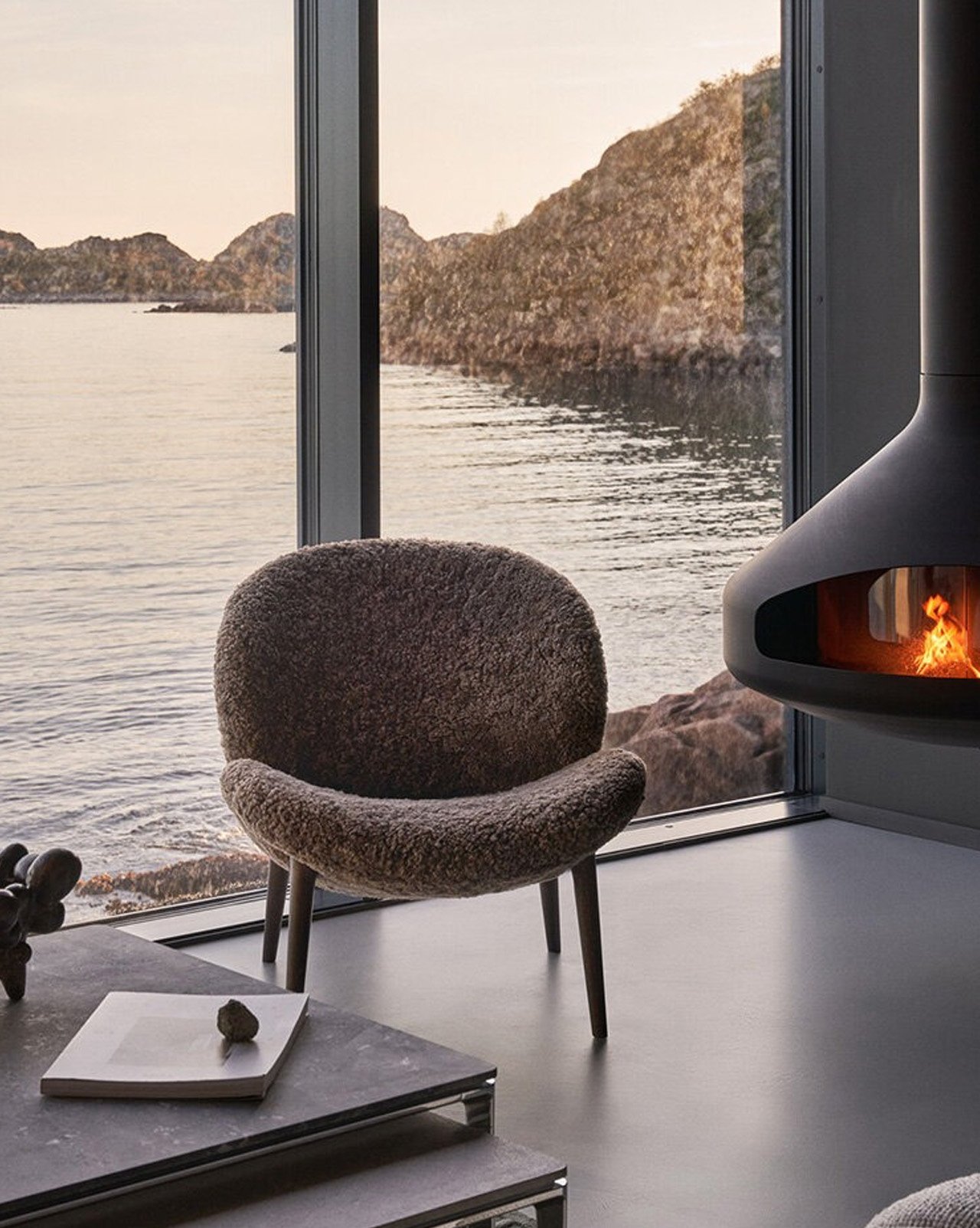 Внутри интерьер оформлен в фирменном минималистском стиле Vipp. Темно-серые стены и тщательно подобранная мебель создает уютные уголки. Подвесная печь под потолком становится центром внимания для встреч, а обивка, изготовленная на заказ, перекликается с цветами и текстурами, видимыми за стеклом.
