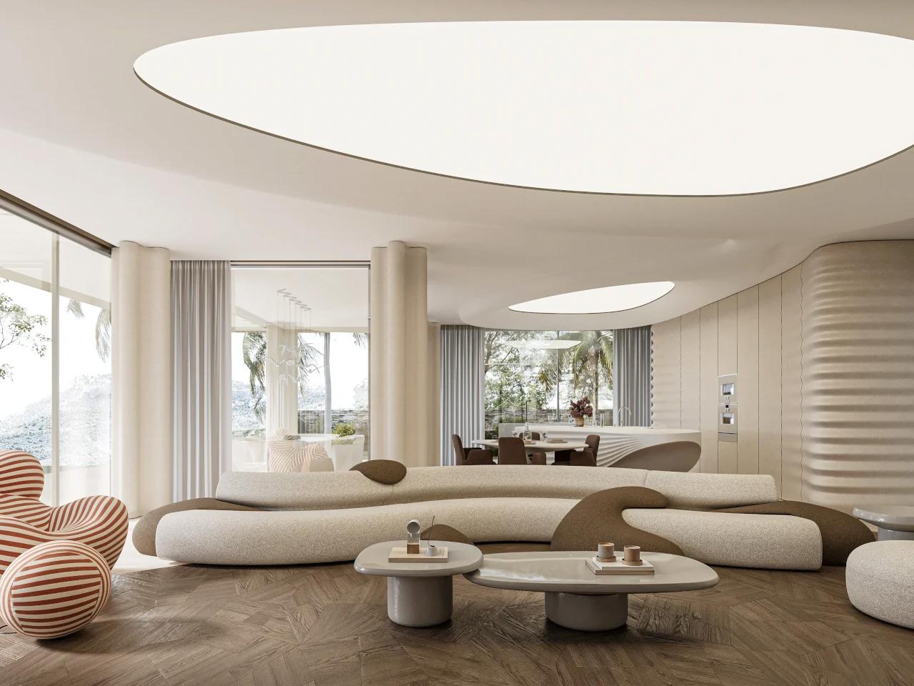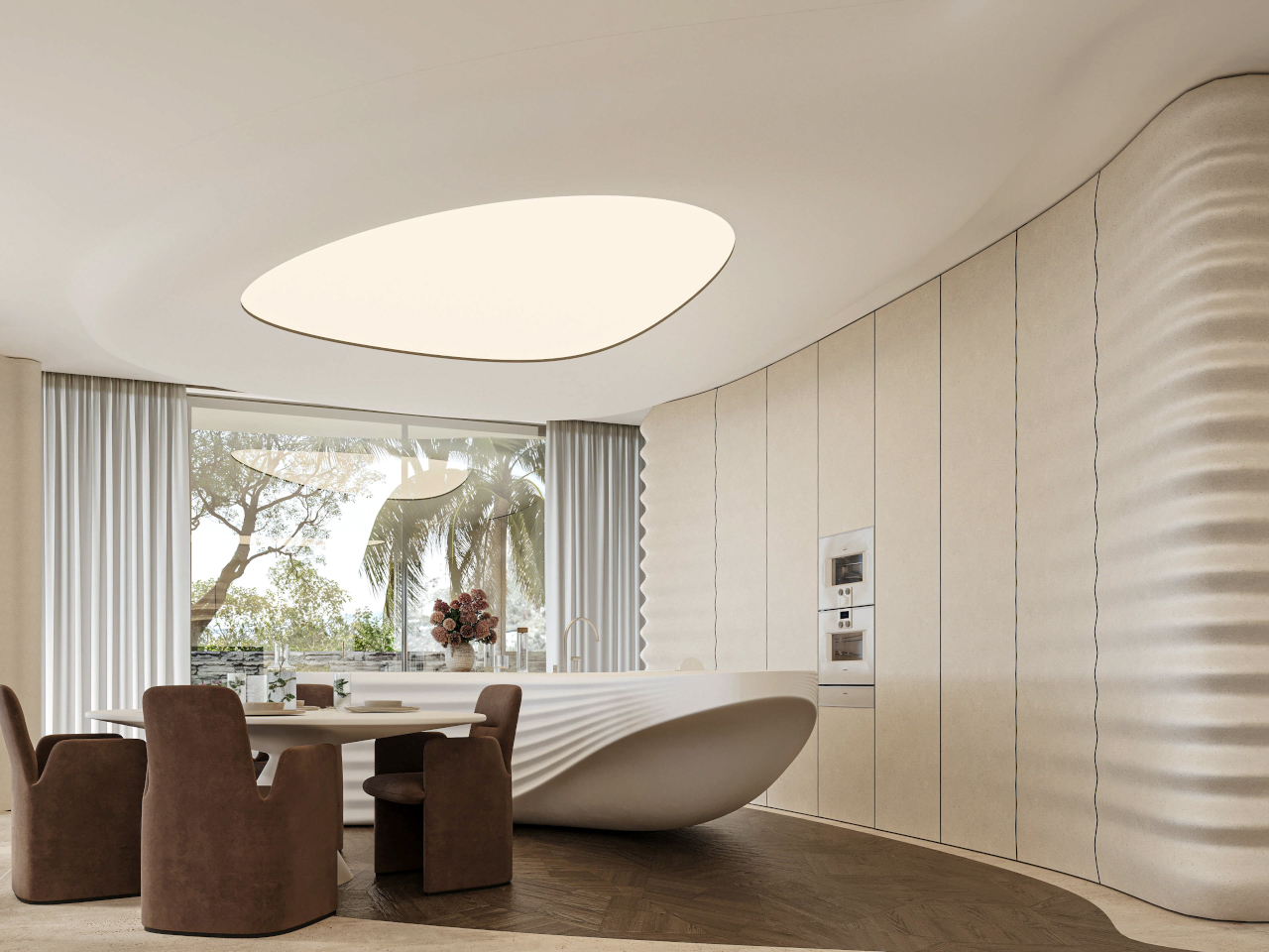 Мебель и ключевые элементы выполнены на заказ: скульптурный кухонный остров, округлые формы, овальная потолочная ниша. При перемещении меняется высота и пластика потолков и стен, создавая эффект «дыхания» пространства. При площади около 400 м² планировка остаётся функционально простой.