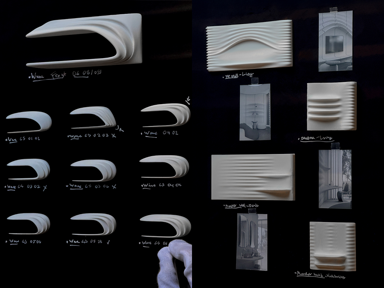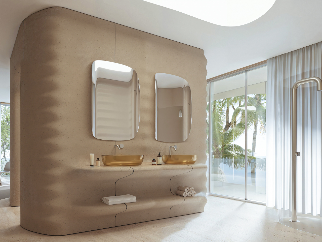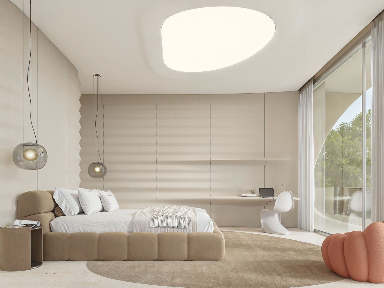 В интерьере волнообразная тема выражена мягче. Бежевые поверхности прорезаны плавными линиями, перекликающимися с внешней геометрией. Палитра построена на белых, песочных и светло-древесных оттенках, что усиливает эффект естественного света. Пространства перетекают друг в друга, создавая ощущение непрерывного ритма.