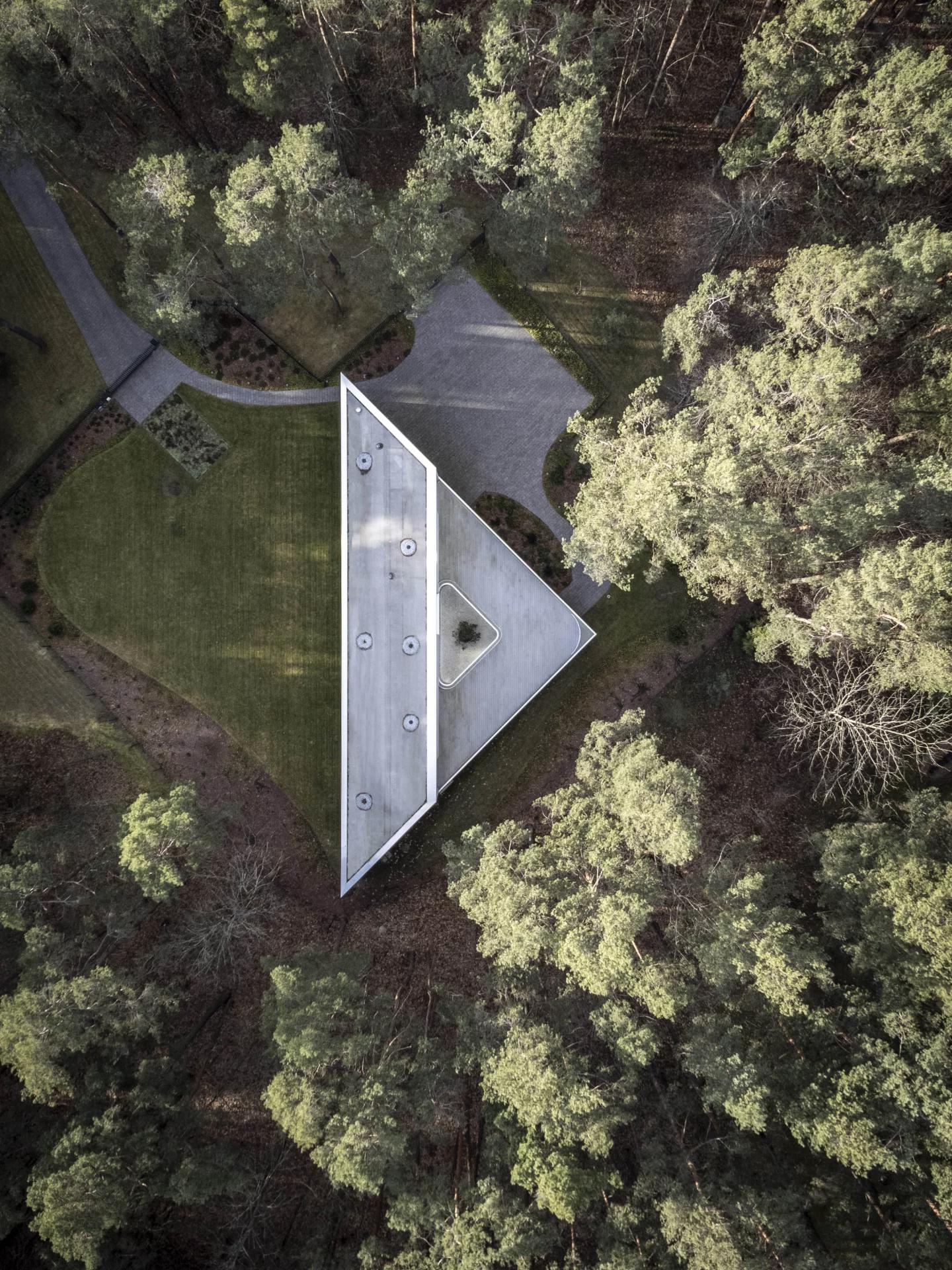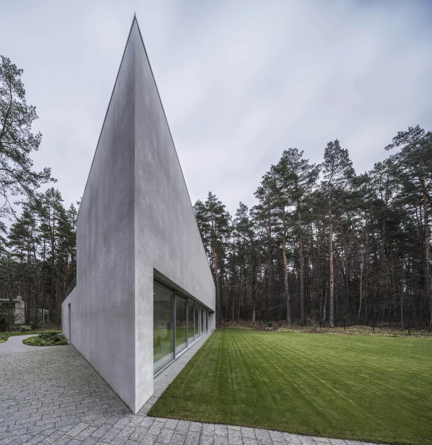 В итоге дом площадью 299 кв. м получил выразительную треугольную форму. Архитектура отличается резкими геометрическими линиями, где бетон и стекло сходятся под острыми углами, формируя динамичный силуэт. Внутренний двор с плавно изогнутой стеной смягчает эту строгость, создавая визуальный баланс между жесткостью и пластикой.