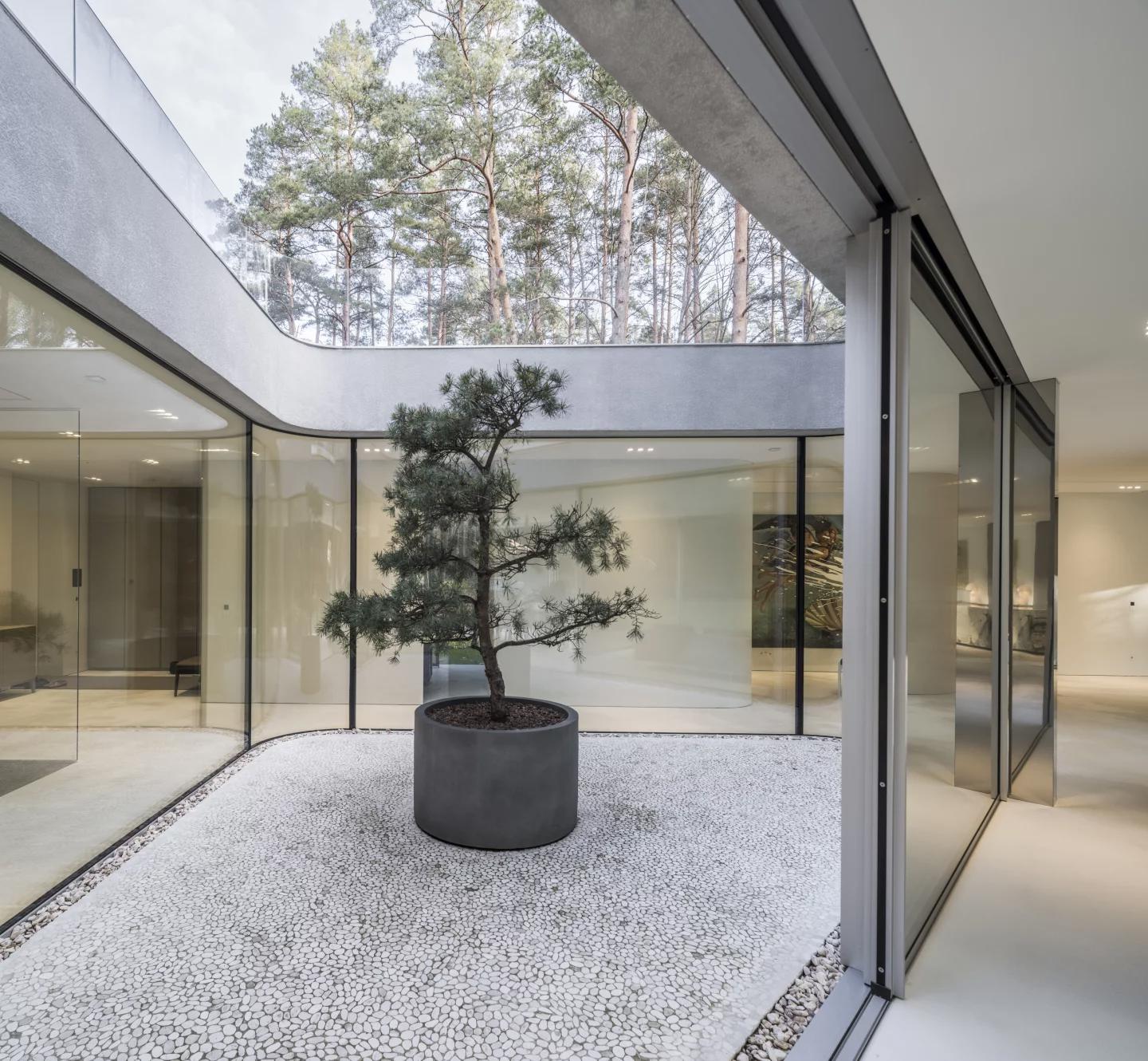 Интерьер выполнен в сдержанном стиле с минимальным количеством декоративных элементов. Центральное место занимает белая винтовая лестница, а кухонный остров с мраморной поверхностью становится ключевым акцентом. Верхний уровень с террасой открывает вид на сосновый лес, обеспечивая уединение, тогда как нижние жилые пространства напрямую связаны с внутренним двором, наполняя дом светом и ощущением открытости.