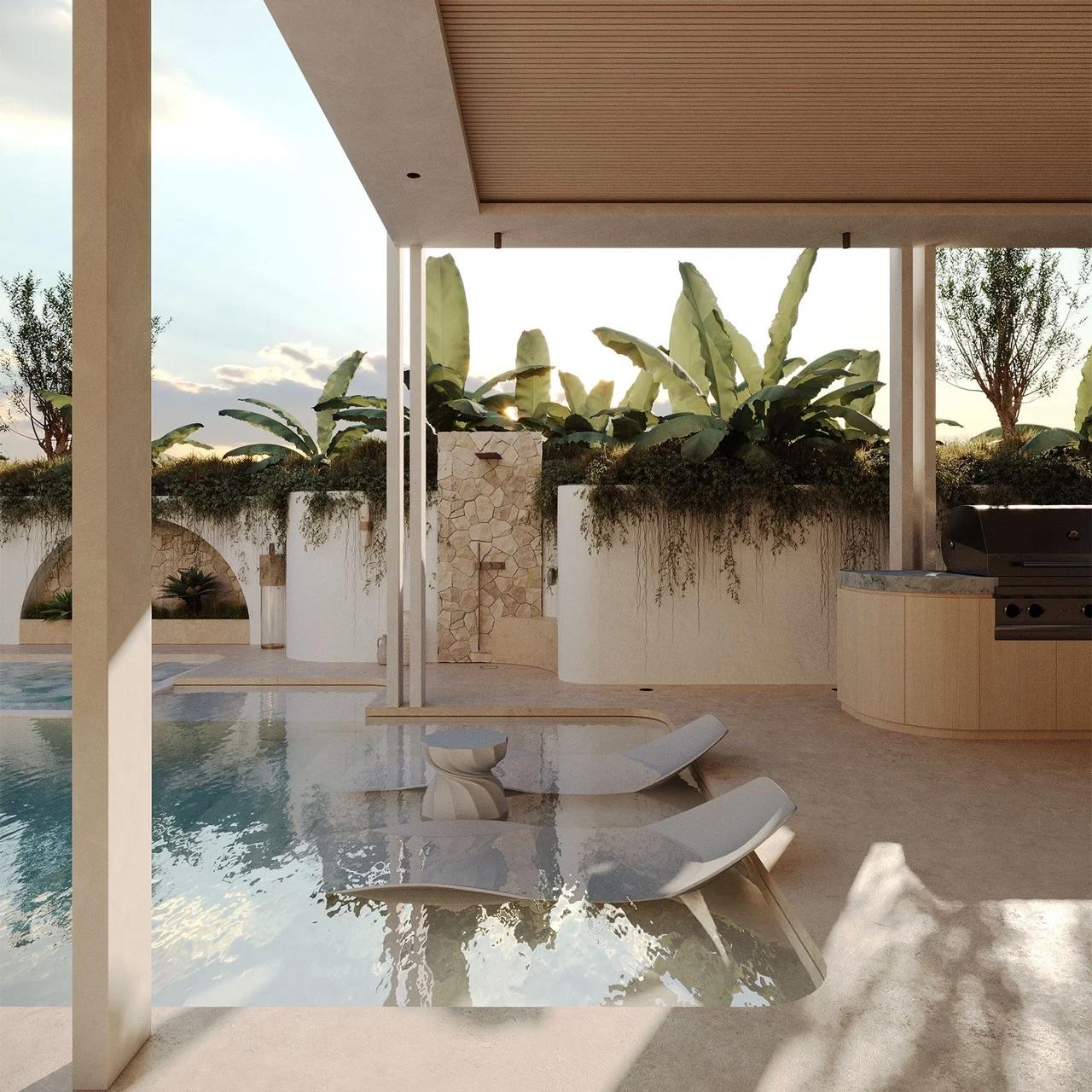 Взаимосвязь с природой здесь не дополнительный слой, а основа. Пышная тропическая растительность каскадами ниспадает с краев террас, окутывает изогнутые стены и проникает в вырезанные пустоты. В строительстве дома была использована палитра из натурального камня, тёплой штукатурки и деревянных акцентов, создающая тактильную, органичную атмосферу. Дизайн интерьера подчеркнут светлыми тонами и тонкими текстурами, которые создают ощущение покоя и уюта.