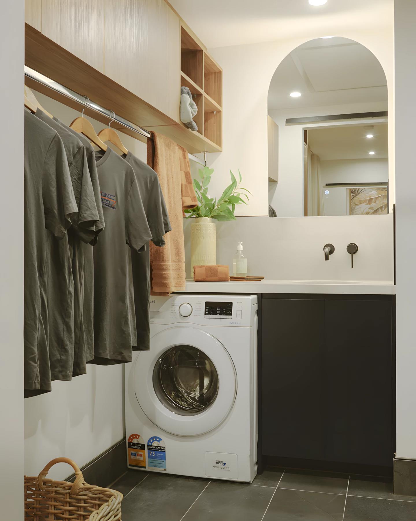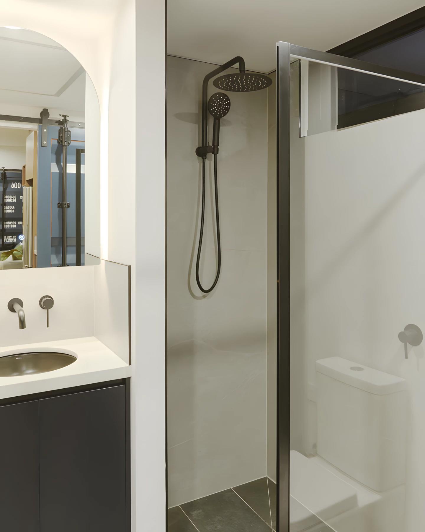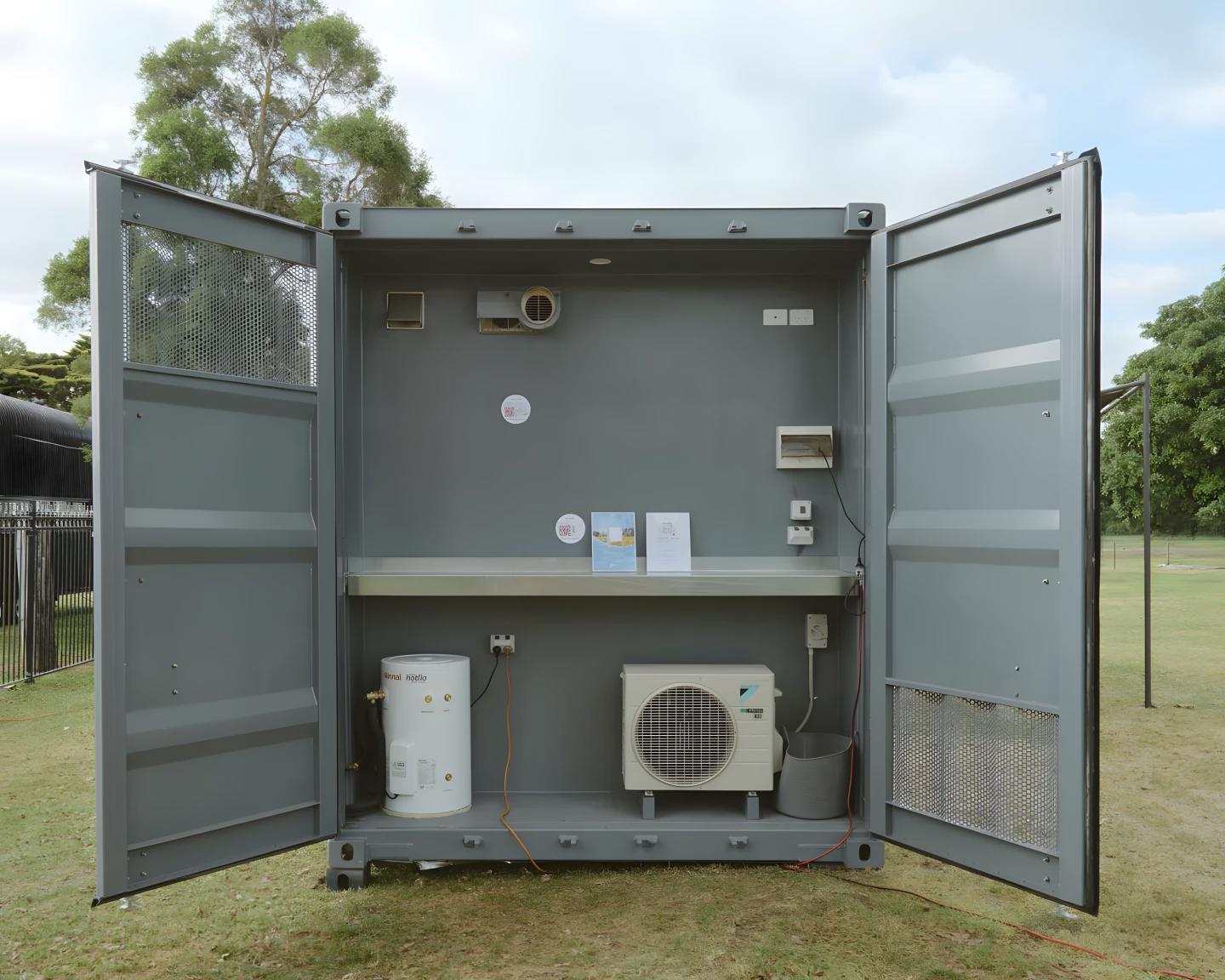 Ванная комната в Mark VI — VIC относительно просторная для небольшого контейнерного дома и оборудована туалетом со смывом, душем и стиральной машиной с сушилкой. Мини-дом оснащен стандартным RV-разъемом, но может быть настроен на полную автономность с помощью солнечной батареи мощностью 4,15 кВт, аккумуляторной батареи ёмкостью 10 кВт*ч и инвертора.