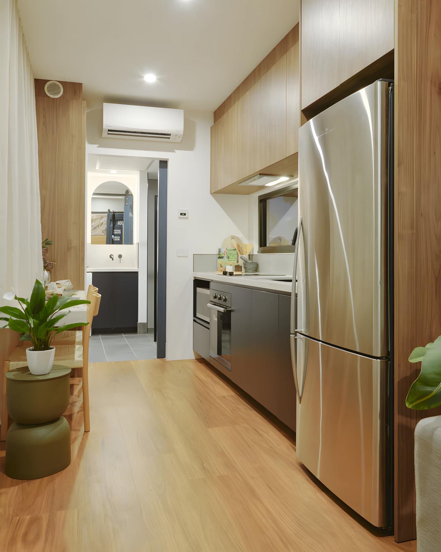 Центральную часть дома занимают гостиная и кухня. В гостиной установлены диван и несколько шкафов для хранения вещей, также имеется место для телевизора и журнального столика. Кухня оснащена холодильником с морозильной камерой, духовым шкафом, индукционной варочной панелью, микроволновой печью и множеством шкафов. Рядом также есть обеденный стол на двоих.