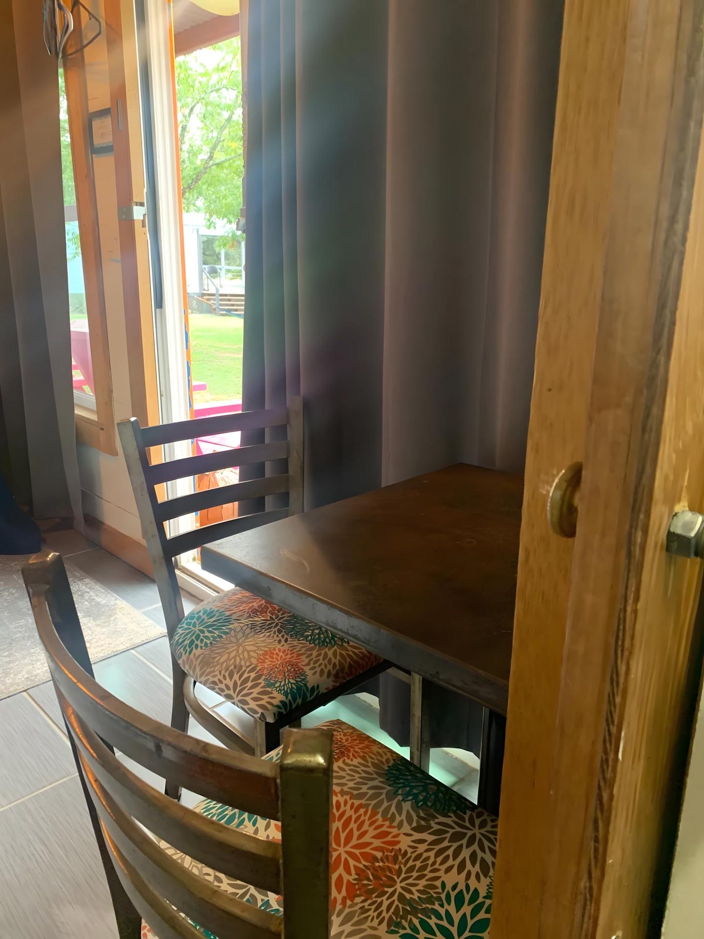 Внутри всё организовано на одном уровне. Центральная зона занята небольшой кухней с базовым оборудованием — холодильником, микроволновкой и обеденным столом. Спальня с двуспальной кроватью совмещает функции зоны отдыха: здесь можно смотреть телевизор или просто расслабиться. Отдельное помещение занимает ванная комната с душем, раковиной и туалетом.