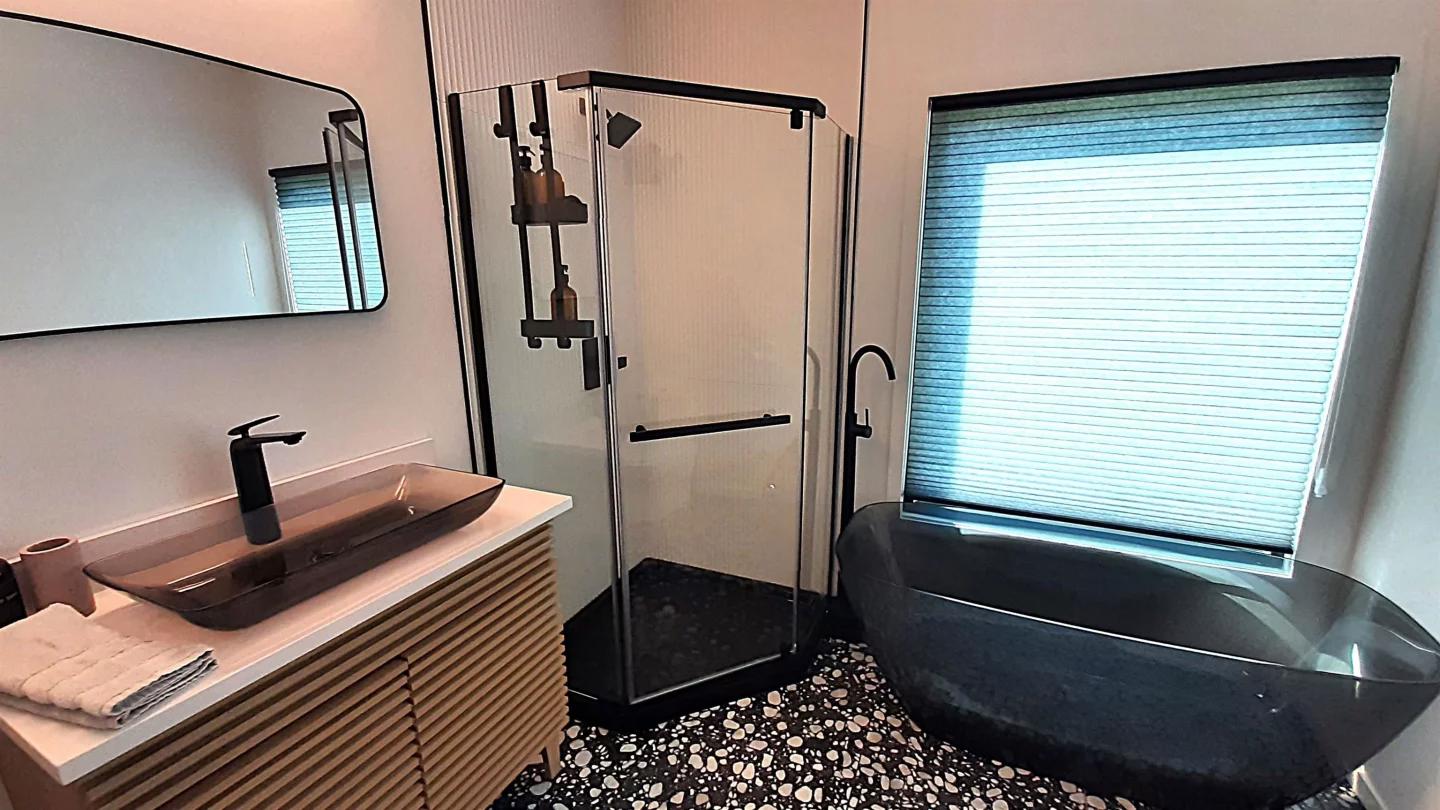 Главная ванная комната выглядит особенно впечатляюще: здесь есть душевая кабина, отдельностоящая ванна, раковина и унитаз. Также в доме предусмотрена вторая ванная, хотя подробности о ней не раскрываются.