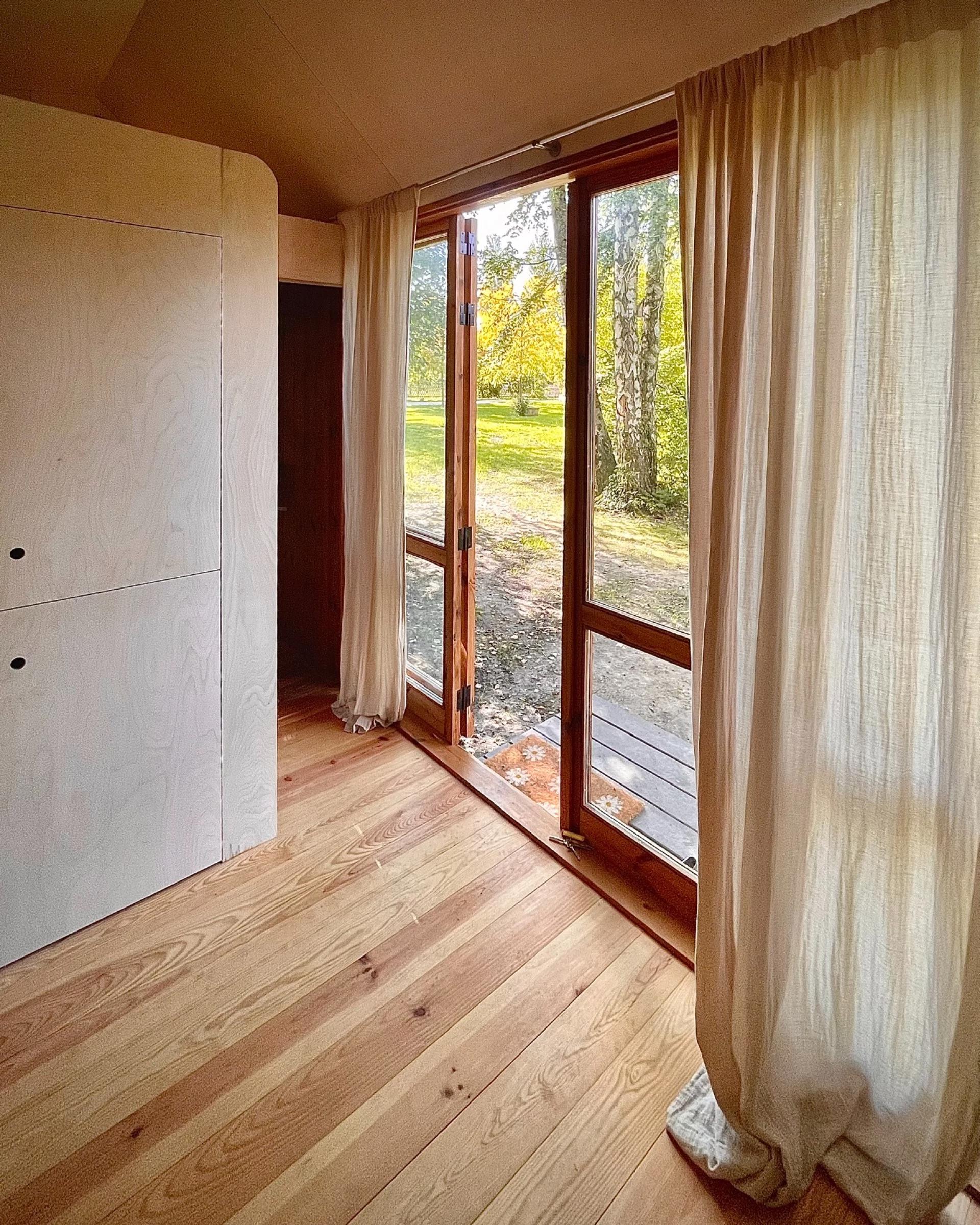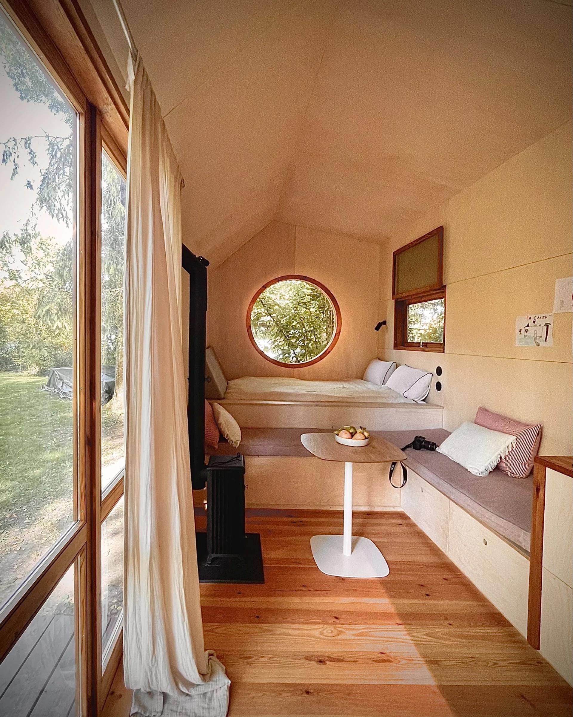 К кухне примыкает гостиная, в которой стоит большой Г-образный диван со встроенным местом для хранения, расположенный вокруг небольшого журнального столика и дровяной печи для обогрева. В доме Berra есть две спальные зоны. Одна расположена внизу, рядом с гостиной, и оборудована двуспальной кроватью с большим остеклением, включая иллюминатор. Кроме того, благодаря расположению на первом этаже, в ней высокие потолки. Вторая спальня, в свою очередь, представляет собой пространство в стиле лофт с низким потолком, куда можно подняться по закрепленной лестнице, и в ней установлена ещё одна двуспальная кровать.