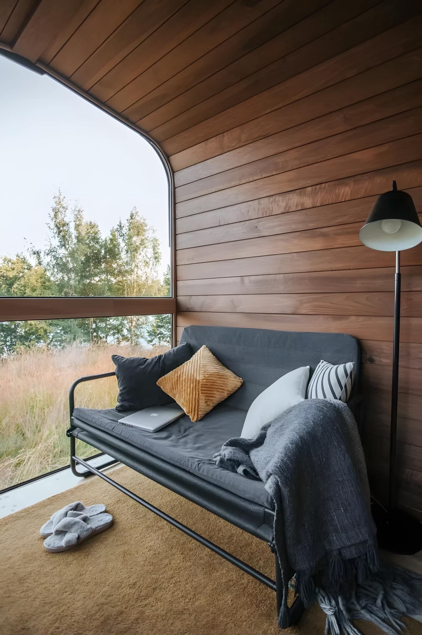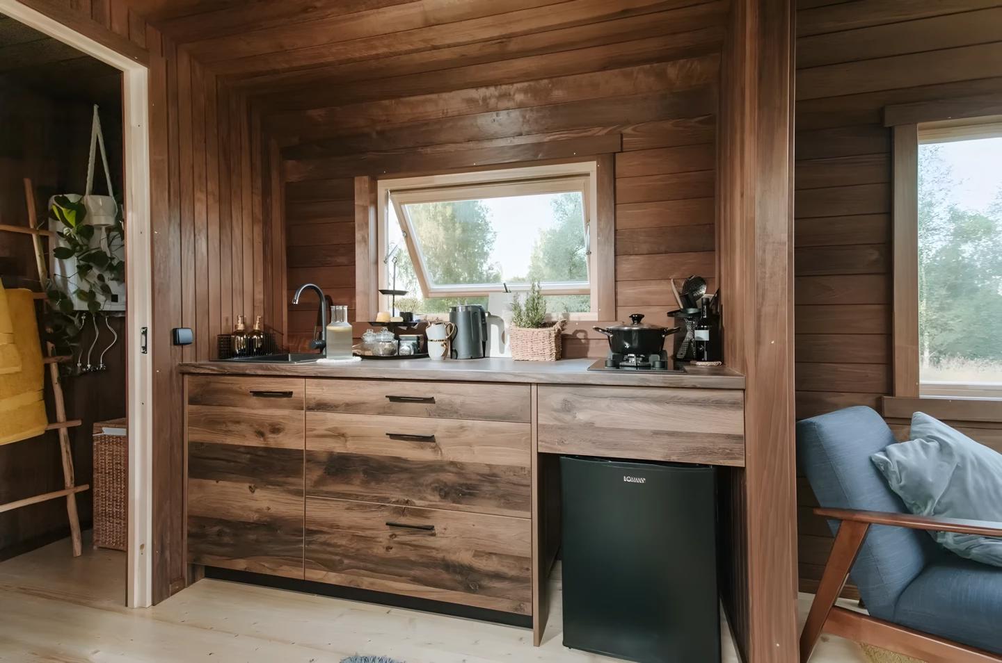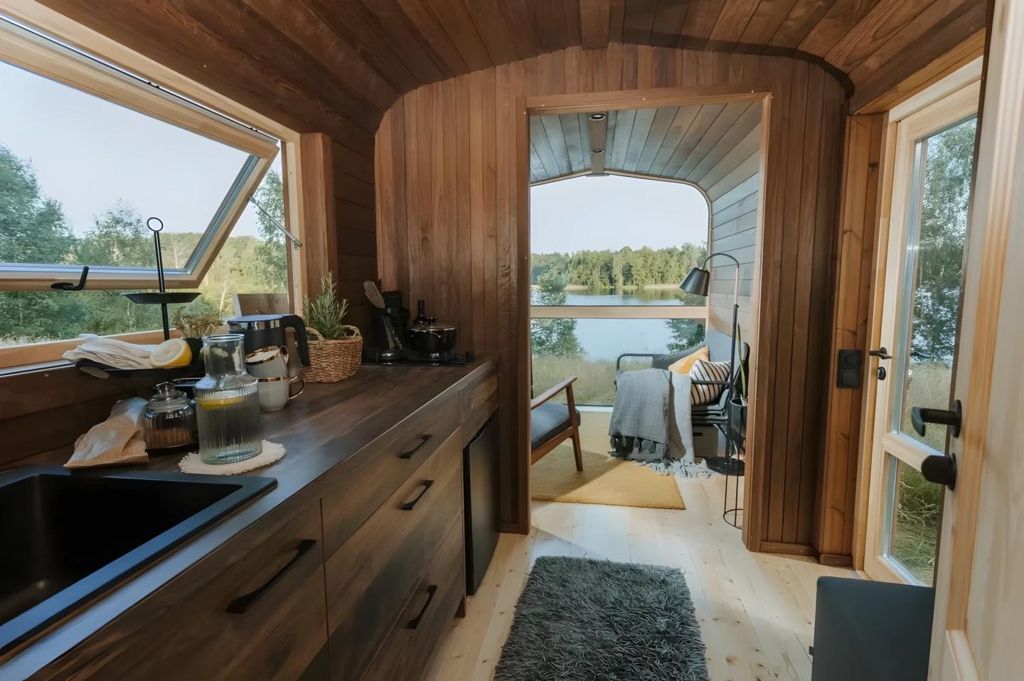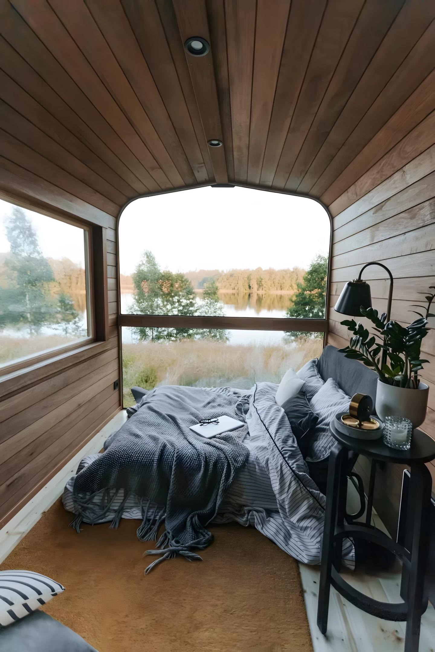 Интерьер одноэтажного домика выглядит теплым и уютным, благодаря использованию большого количества древесины. Гостиная/спальня расположена в задней части дома (напротив фаркопа) с большим окном от пола до потолка. Кроме того, есть место для сидения и диван-кровать на двоих.