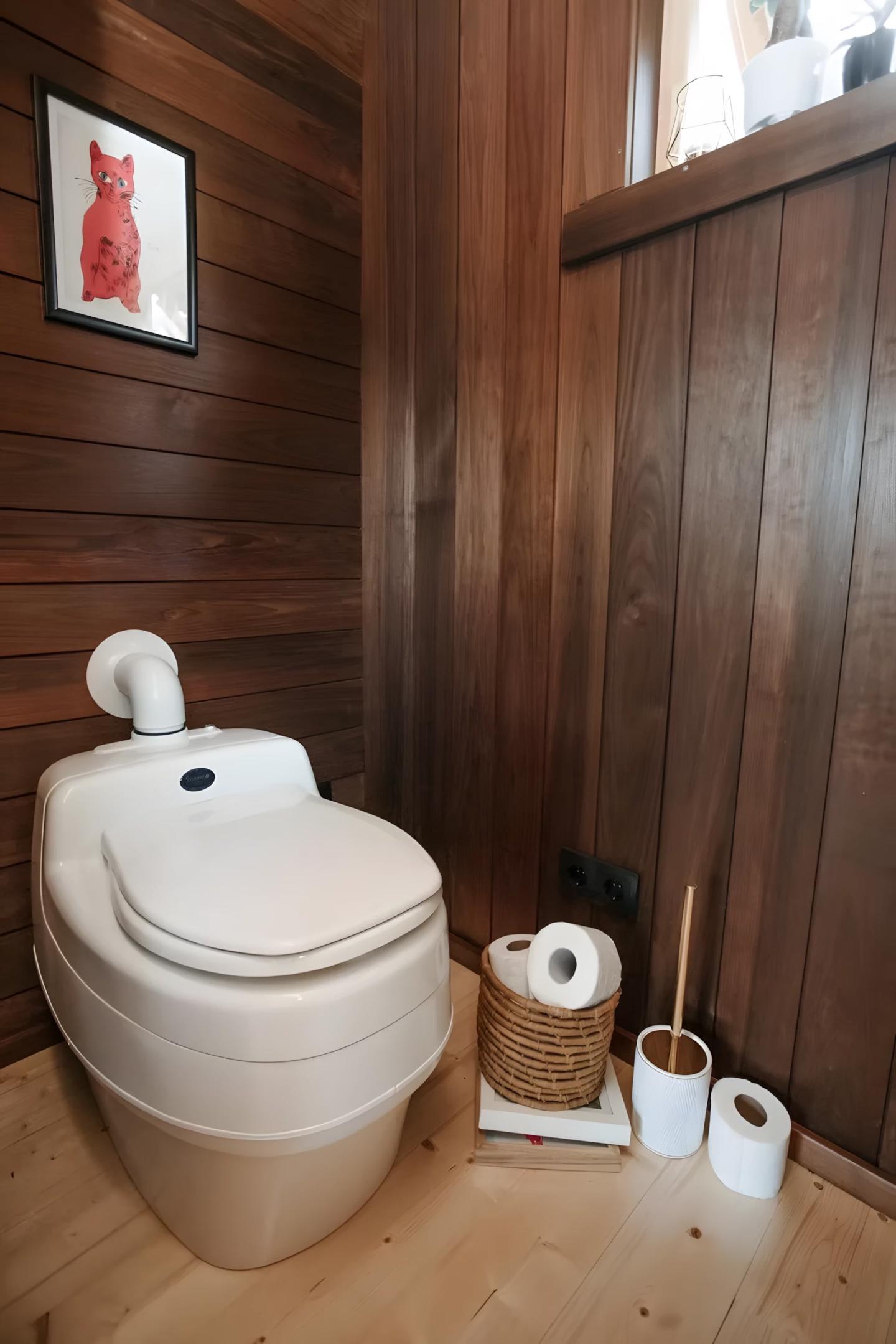 Ванная комната расположена в передней части дома, напротив гостиной/спальни, и довольно небольшая и простая. Представленная модель оснащена туалетом, раковиной и душем.
