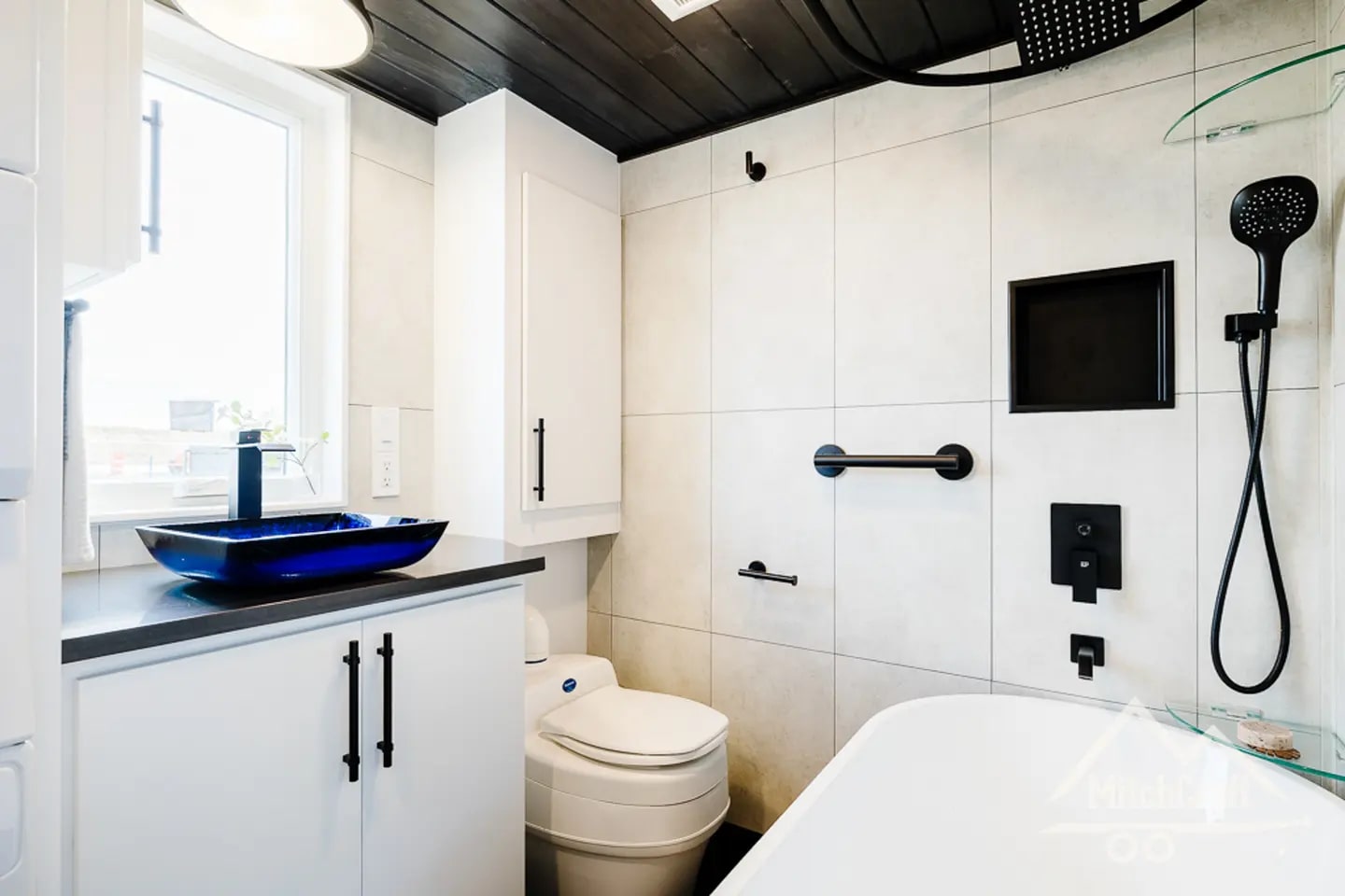 Рядом с кухней расположена относительно большая ванная комната, которая оснащена биотуалетом, стиральной и сушильной машинами, раковиной, а также полноценной ванной с душем.