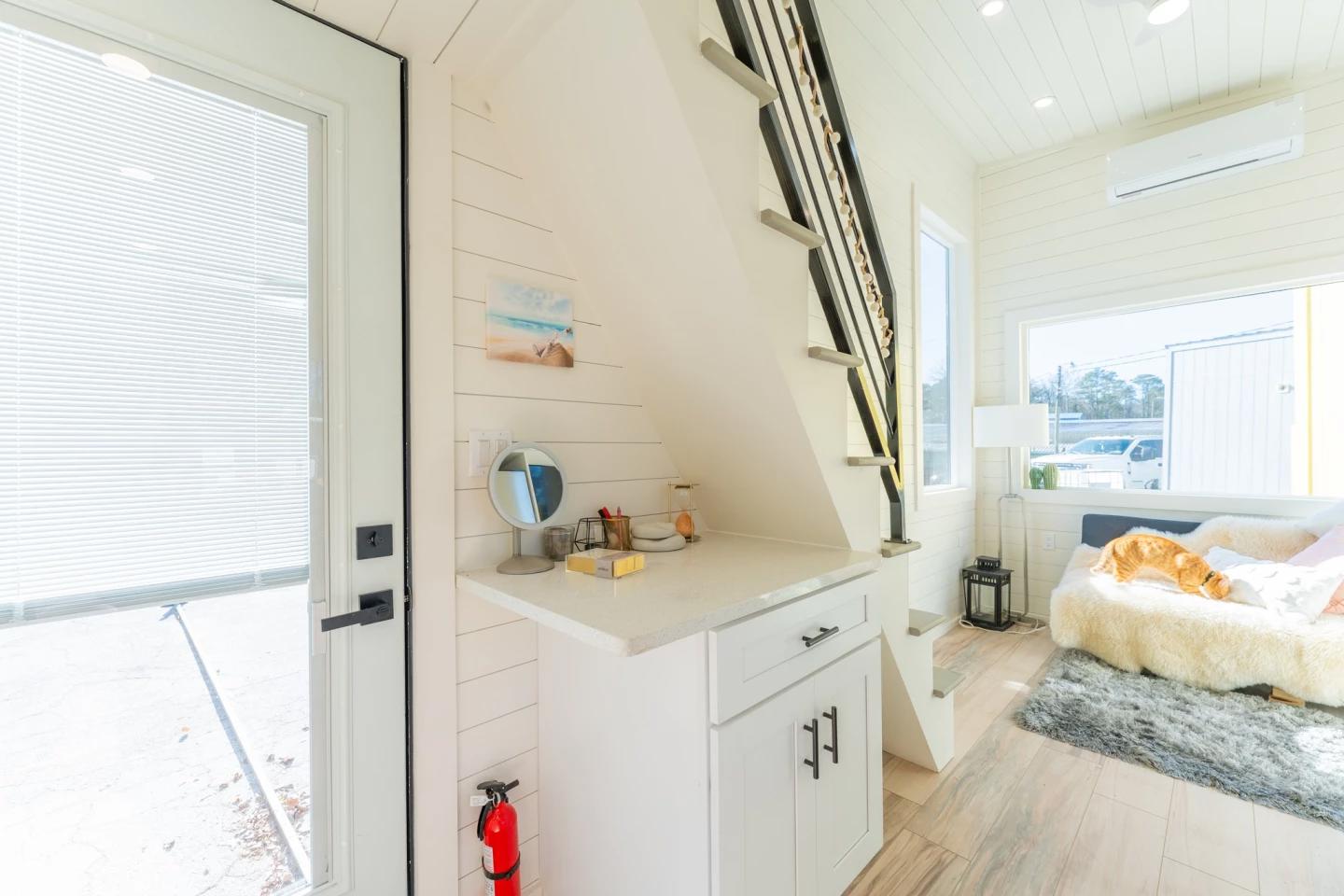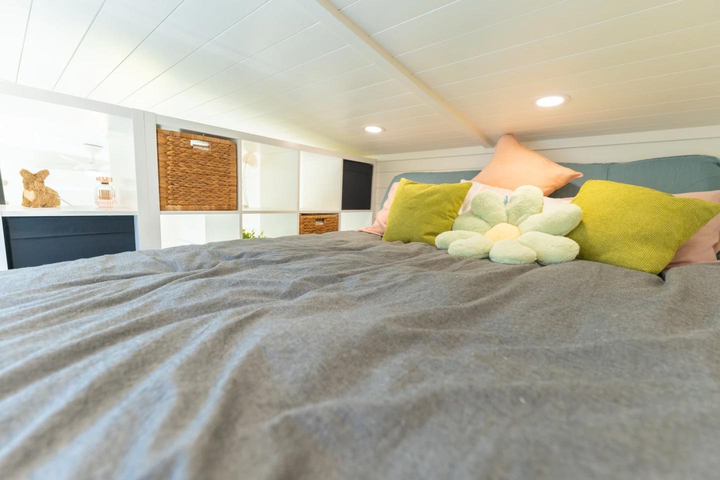 На первом этаже находится компактный санузел с душевой кабиной, умывальником с тумбой и туалетом. Планировка выполнена максимально практично с учётом ограниченной площади. Спальная зона представляет собой лофт, куда ведёт лестница. Это пространство с невысоким потолком рассчитано на двуспальную кровать и включает небольшие зоны хранения.