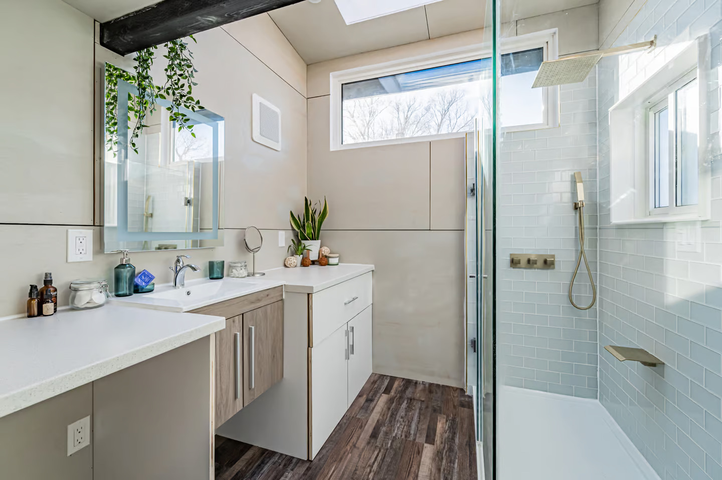 Дом на колесах Elevate со стандартным RV-разъемом основан на двухосном прицепе и имеет длину 7,3 метра. Интерьер обставлен шкафами Ikea, которые были выбраны вместо встроенной мебели в целях снижения расходов.