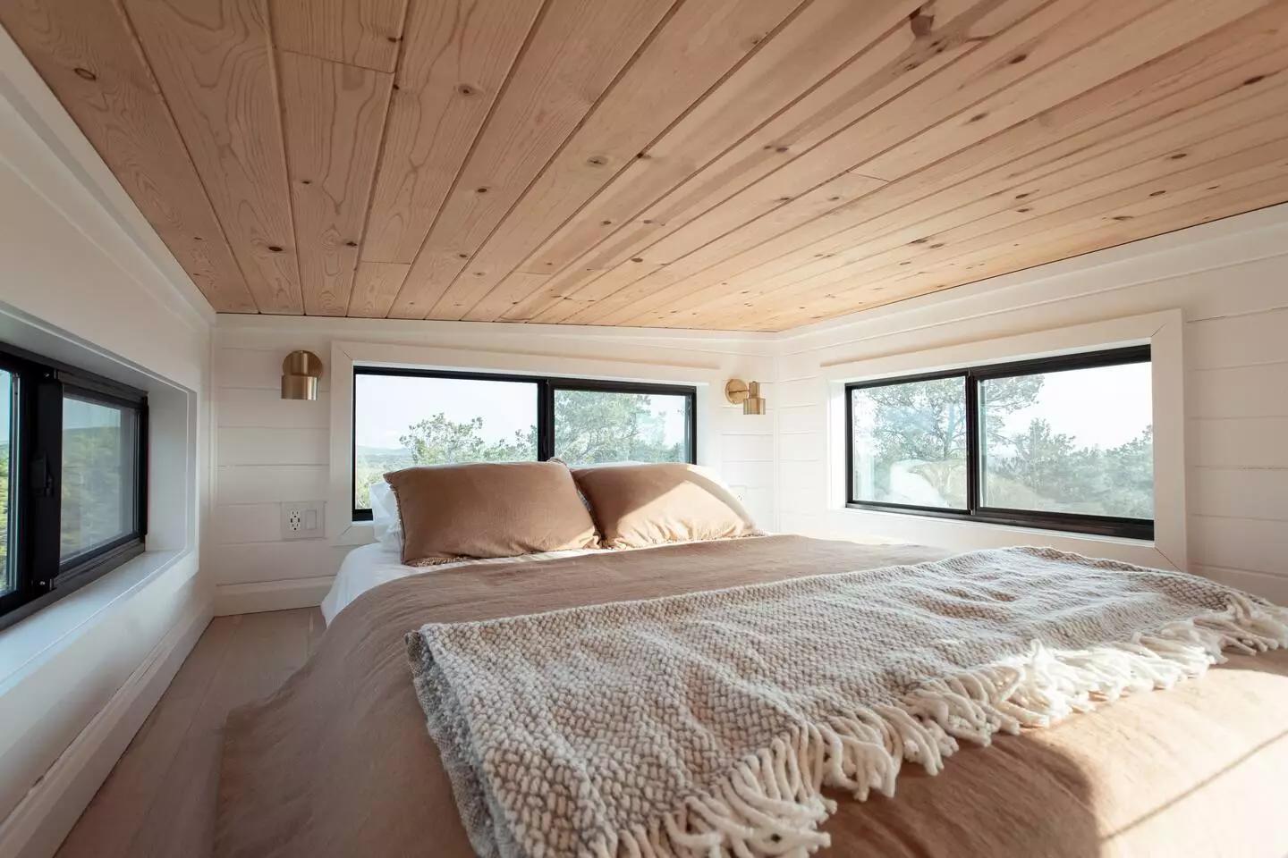 В доме предусмотрены две спальни-лофта с низкими потолками. Главная расположена над ванной и доступна по лестнице со встроенными системами хранения. Вторая находится над гостиной и оборудована съемной лестницей. Обе рассчитаны на двуспальные кровати.