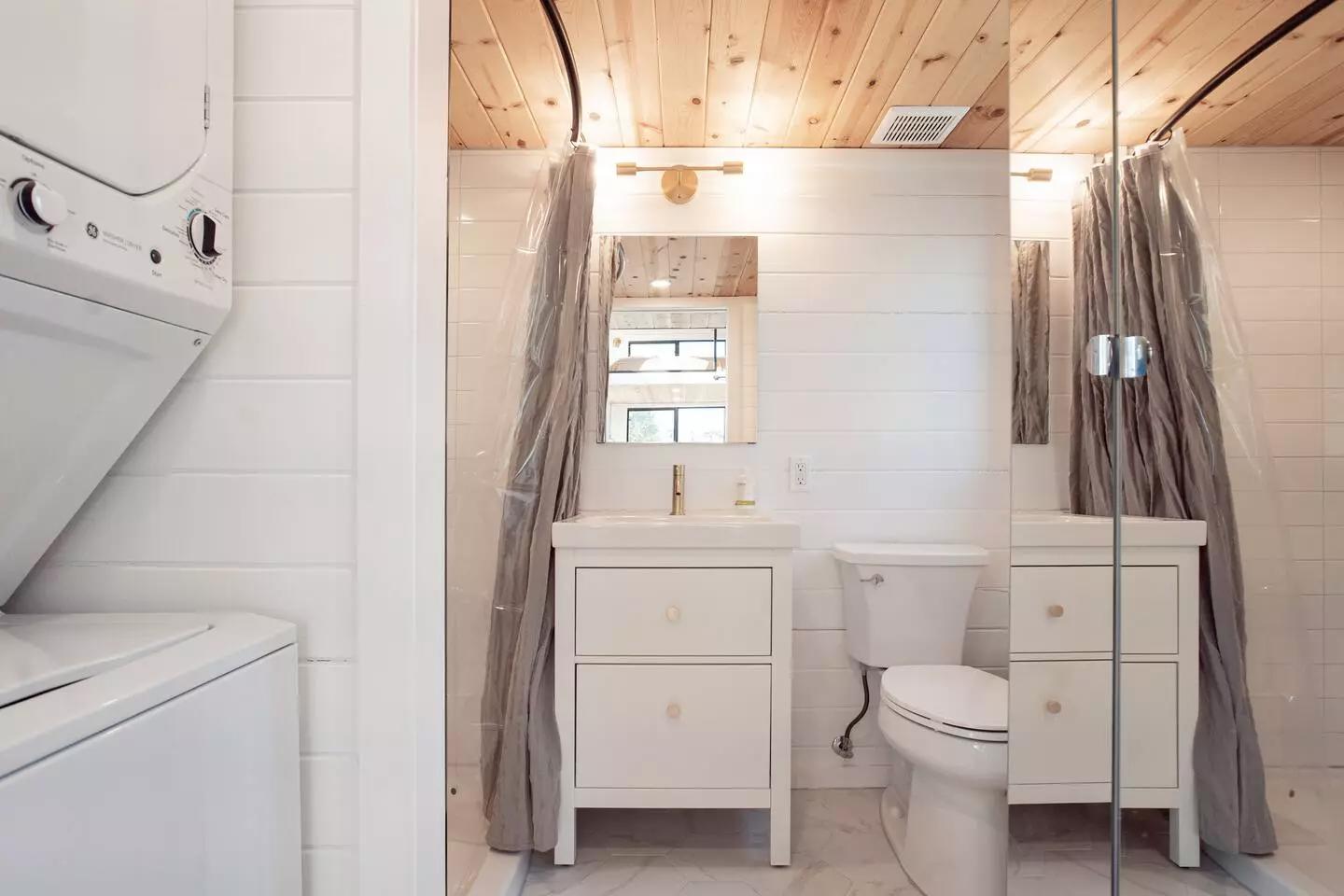 Кухня расположена в центре и продумана до мелочей. Она оснащена глубокой раковиной, индукционной плитой, духовкой и холодильником с морозильной камерой. Несмотря на компактность, здесь достаточно шкафов и рабочих поверхностей для повседневной жизни. Рядом находится небольшой прачечный модуль со стиральной и сушильной машинами. Ванная комната включает душ, унитаз и раковину с тумбой, предлагая уровень удобства, сопоставимый с обычной квартирой.