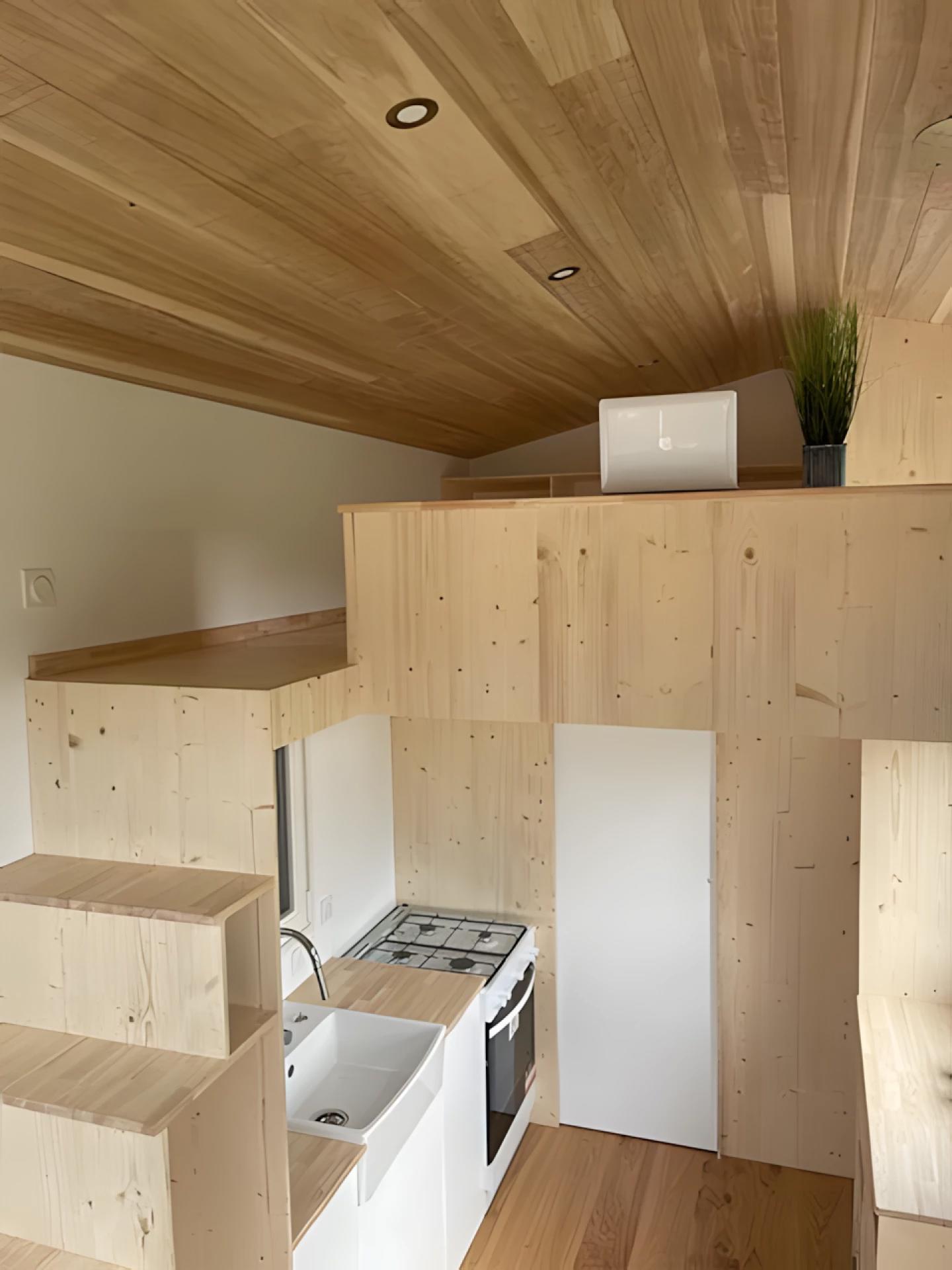 Проект разработан французской компанией Lou Tiny House. Дом построен на двухосном прицепе и имеет длину всего 5,8 метра, что делает его одним из самых компактных в своем классе. Снаружи он отделан еловой древесиной и дополнен металлической крышей, что придает ему аккуратный и современный вид.