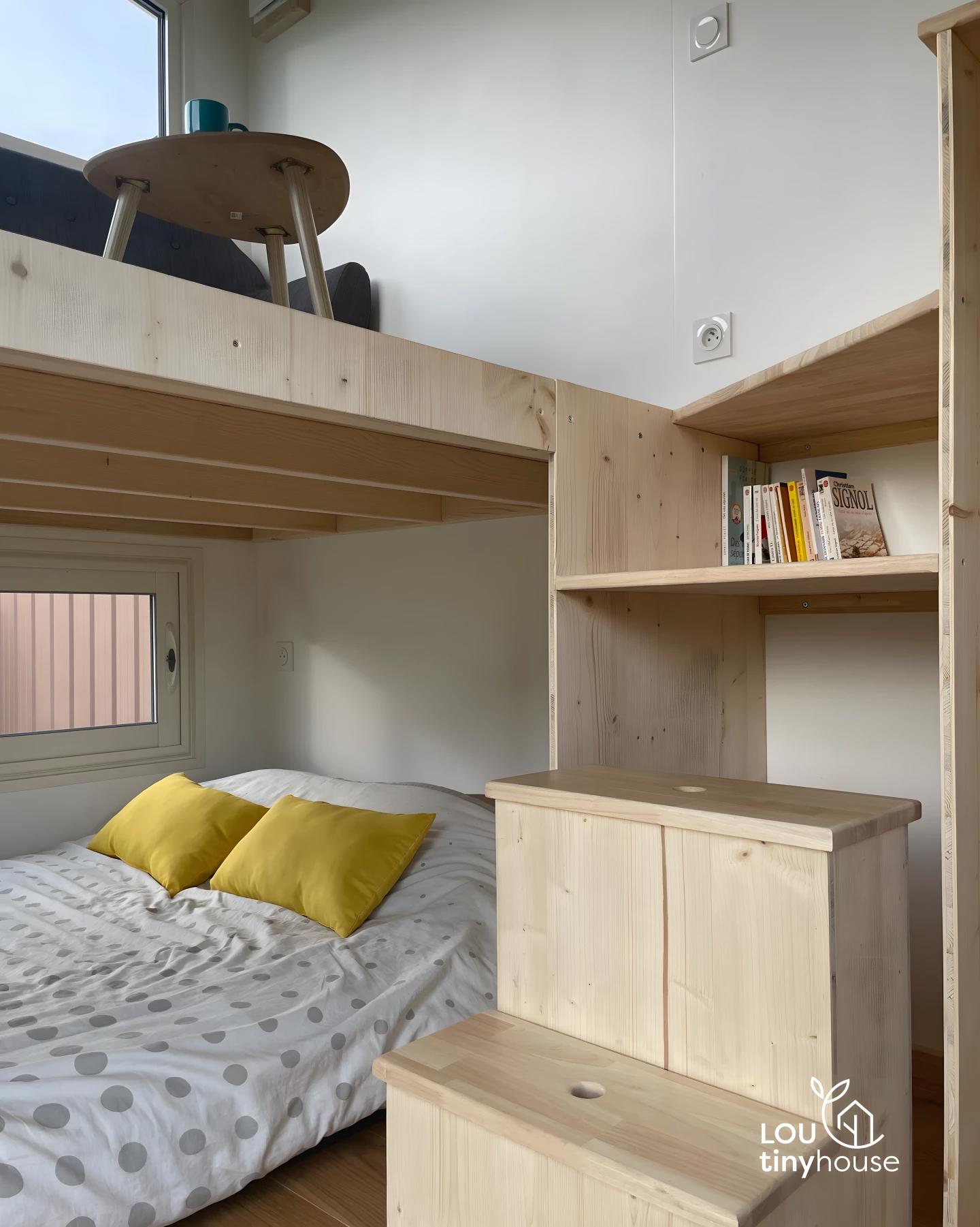 Внутреннее пространство организовано необычно. Гостиная расположена на верхнем уровне и доступна по съемной лестнице. Это уютная зона с диваном и столом, отделенная от основной части дома. Под ней находится спальня с двуспальной кроватью — компактная, но удобная для повседневного использования.