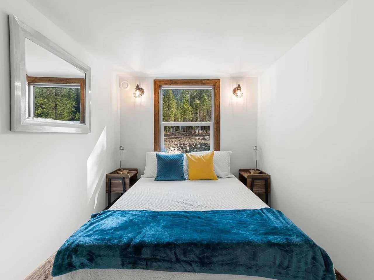 Спальня расположена на одном этаже с гостиной и имеет небольшое окно. Она оборудована полноразмерным главным шкафом, а в соседней ванной комнате установлены большая ванна, шкаф с зеркалом и туалетный столик с современными светильниками. Декор мини-дома подчеркивается нейтральными тонами, белой мебелью, деревенскими акцентами и отделкой из восстановленной 100-летней амбарной древесины. Площадь первого этажа составляет 37,1 кв. метров, а наверху имеется просторная мансарда.