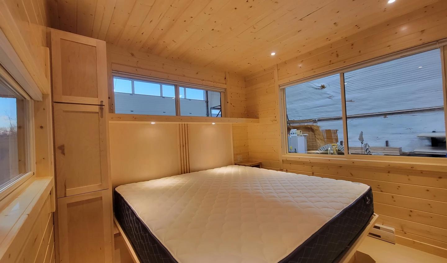 Ванная комната находится рядом и выглядит довольно уютной, с душевой кабиной, унитазом и небольшой раковиной. Спальня в мини-доме eVista King расположена на противоположной стороне от веранды и довольно просторная. В комплектацию входит большая двуспальная кровать и множество мест для хранения вещей, а благодаря одноэтажной планировке в ней достаточно места над головой.