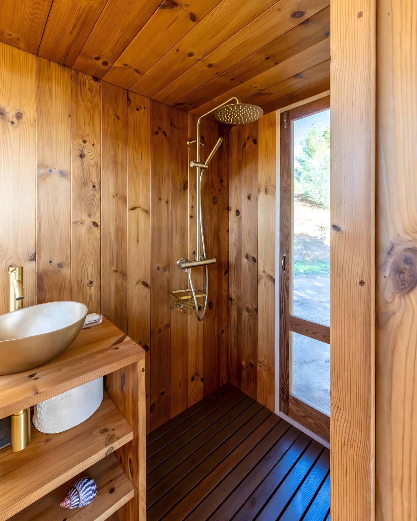 Из кухни через распашную дверь можно попасть в ванную комнату с деревянной отделкой. В ней находится открытая душевая зона, раковина с тумбой и туалет. Кроме того, вторая дверь в этой комнате ведет наружу.