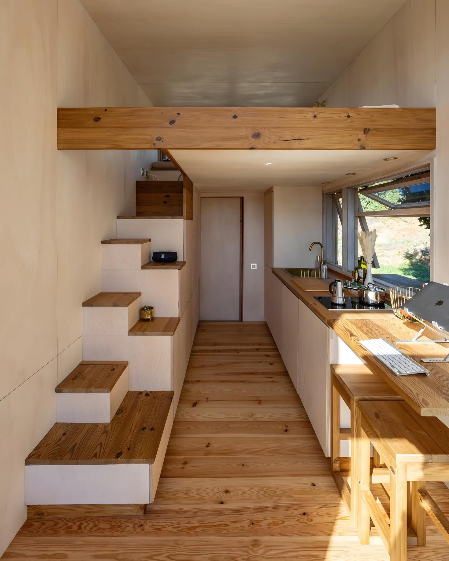 Внутри домик разделен на два этажа, причем на первом этаже расположена большая гостиная. Она включает рабочую зону, которая одновременно служит обеденным столом, а также несколько мест для сидения. Рядом находится кухня с индукционной плитой – что примечательно, поскольку пропан часто используется в автономных постройках, так как не требует электричества. Также имеется раковина и дополнительная бытовая техника, спрятанная в просторных шкафах.