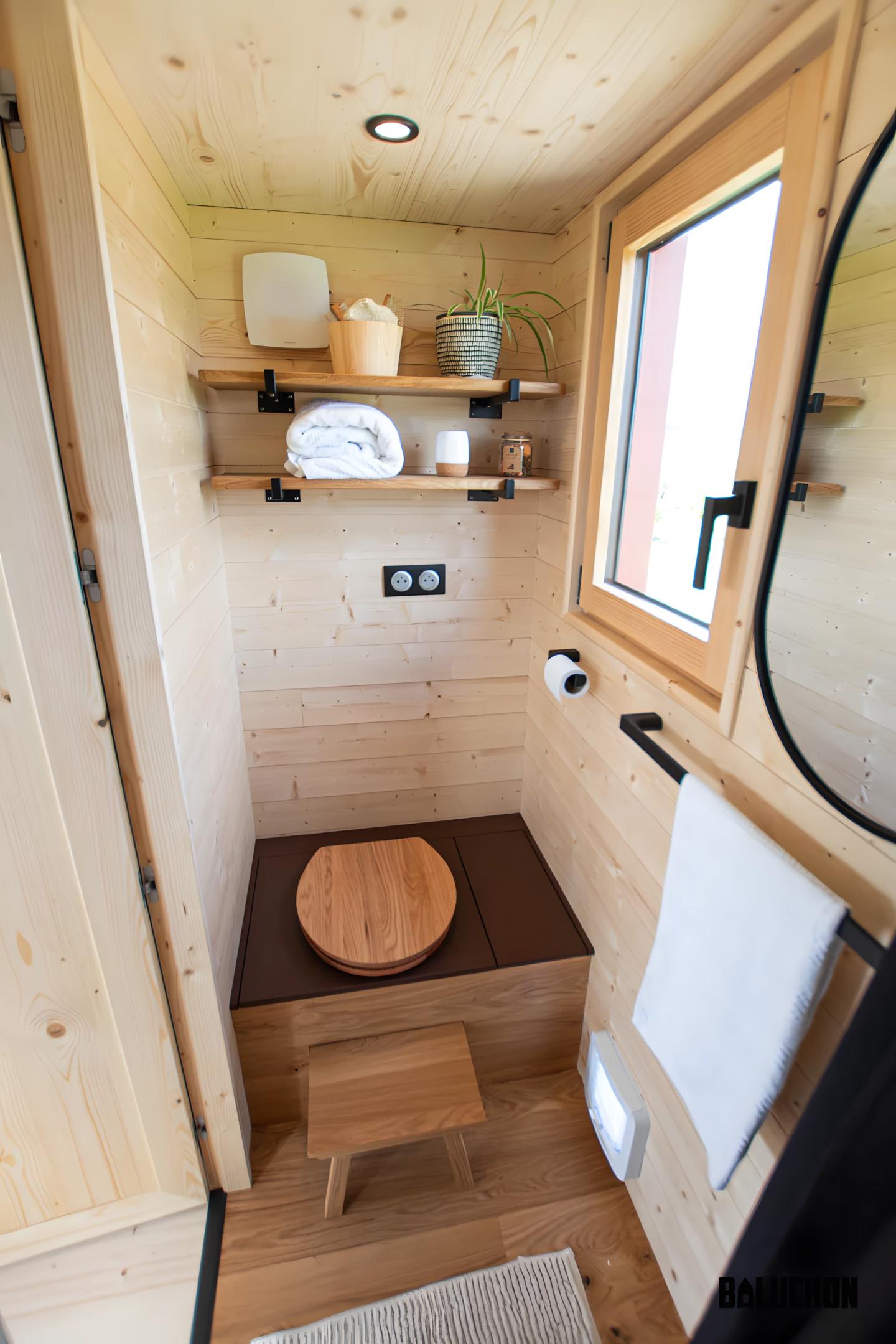 Кухня в Tiny House Into the Woods небольшая и простая, как и в большинстве французских мини-домов. Она включает мини-холодильник, 2-конфорочную плиту на пропане и раковину. Также есть шкафы и дополнительное место для хранения напротив основного кухонного гарнитура. Ванная комната компактная, с туалетом и душем, но без раковины.