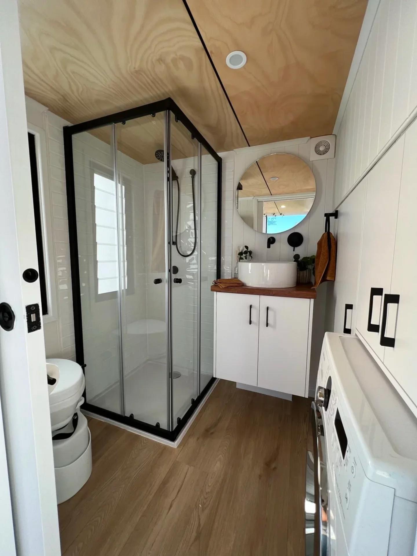 Ванная комната расположена напротив гостиной и включает душевую кабину, раковину и компостный туалет, а также стиральную машину с сушкой. Спальня выполнена в формате лофта и доступна по лестнице со встроенными шкафами. Особенность конструкции — заниженная платформа, позволяющая стоять в полный рост и свободно передвигаться, что делает пространство значительно удобнее.