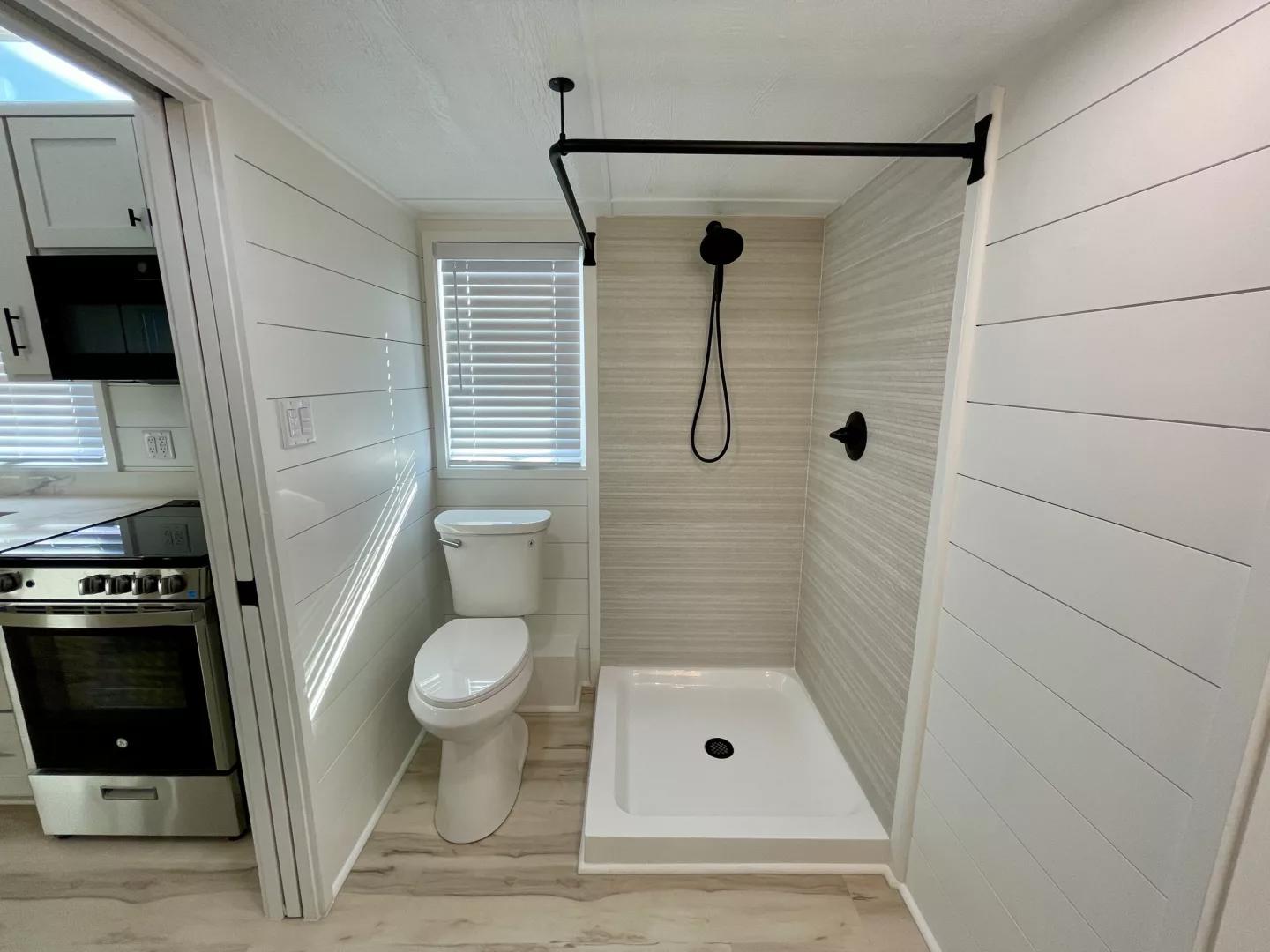 Ванная комната соединена с кухней. Здесь заметно увеличенная ширина, благодаря чему удалось разместить душ, унитаз со смывом, раковину с чуть большим количеством места для хранения, а также стиральную машину и сушилку, установленные друг на друга, вместо более типичной комбинированной стиральной машины с сушкой.