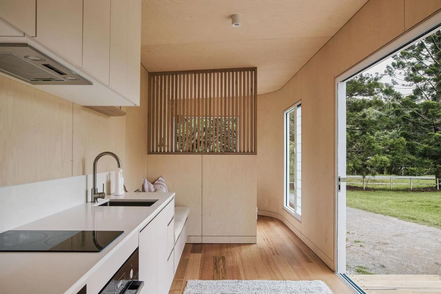 Декор интерьера выполнен по высшему разряду, а сам дом имеет удобную одноэтажную планировку. Большие двустворчатые стеклянные двери ведут сразу на кухню, довольно просторую для такого маленького дома. Кухня оборудована индукционной варочной панелью, мини-холодильником и кухонными шкафами. По желанию можно установить дополнительную бытовую технику, включая духовку и посудомоечную машину.