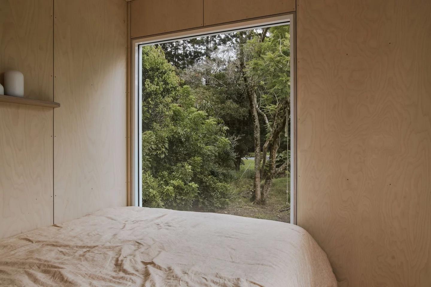 К кухонному блоку примыкает диван-кровать со встроенной системой хранения. Перегородка отделяет гостиную/кухню в крошечном доме Harper от спальни. Это небольшое и лаконичное пространство, которое оживляет изогнутая стена. В этой комнате хватает места только для установки двуспальной кровати.