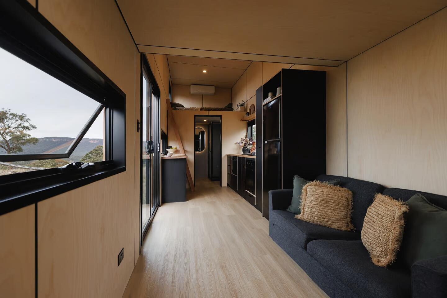 Мини-дом Hartley основан на двухосном прицепе и облицован черным металлом и подключением к источнику питания через стандартный RV-разъем. Большое остекление обеспечивает максимальное естественное освещение внутреннего пространства.