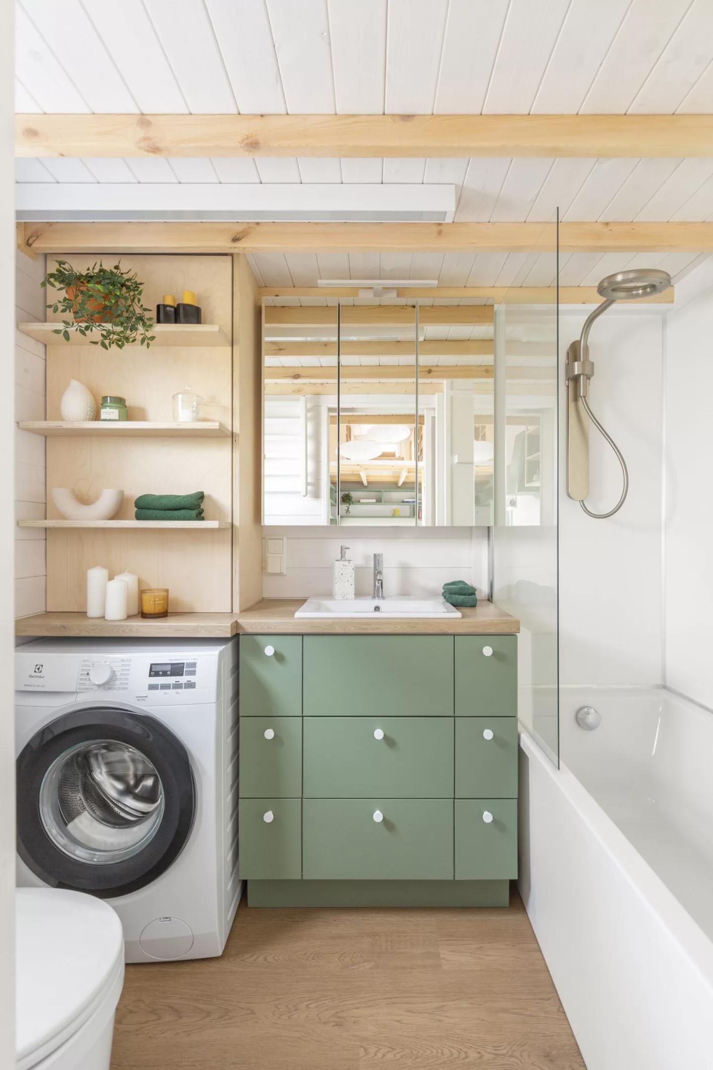 Ванная комната, расположенная в противоположном конце дома от гостиной, удивляет своей полнотой: здесь есть стандартная ванна с душем, раковина с тумбой, унитаз, стиральная машина с сушкой и несколько мест для хранения. Это редкость для мини-домов и делает пространство особенно комфортным для жизни.