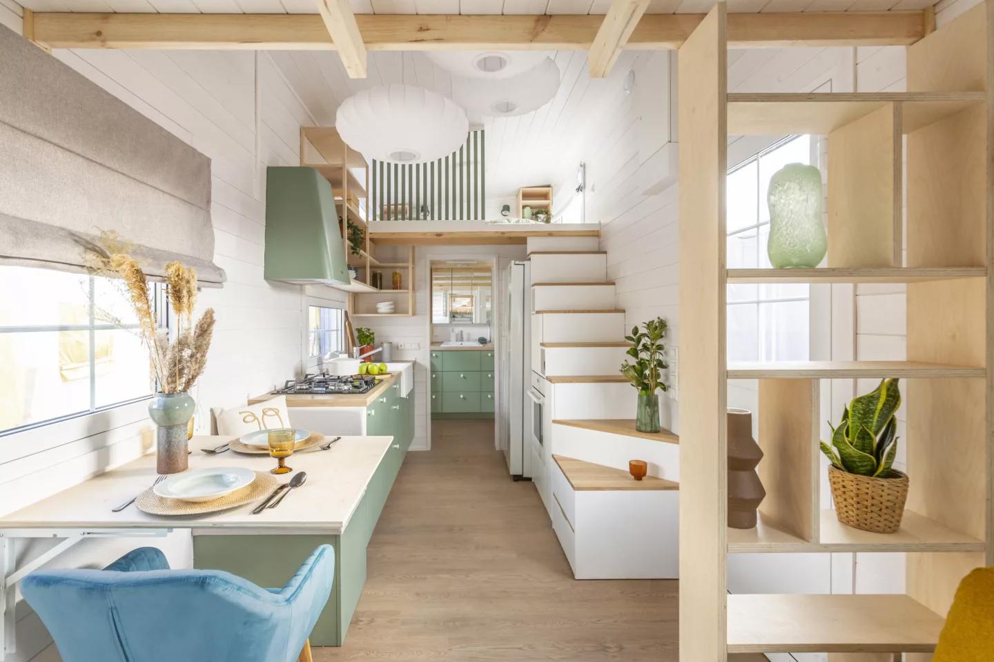 Мини-дом Ingrid демонстрирует, как небольшое пространство можно использовать максимально эффективно. Здесь продумано каждое место для хранения — от углов и ниш до встроенных шкафов и ящиков. Это позволяет разместить не только крупные предметы, но и мелкие вещи, сохраняя порядок и функциональность даже в ограниченных размерах.