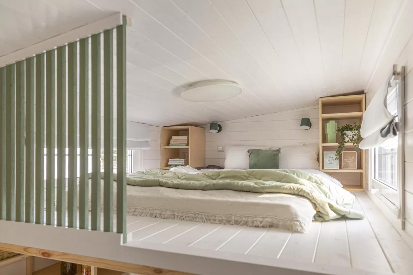 Дом включает две спальни в стиле лофт с низкими потолками. Главная спальня расположена над кухней и ванной, к ней ведет лестница со встроенными шкафами. Здесь размещена двуспальная кровать и дополнительные места для хранения. Вторая спальня находится над гостиной, доступ к ней осуществляется по съемной лестнице, и она также предлагает просторные возможности для хранения, при этом может использоваться как обычная спальня.